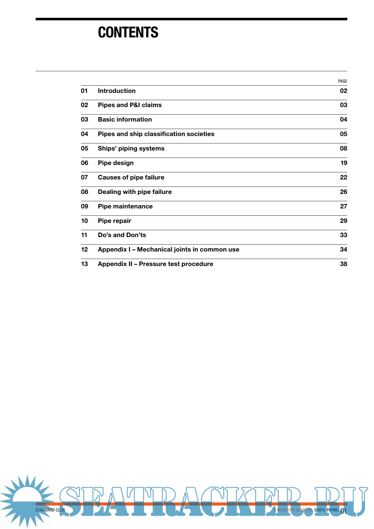 Year: 2012 Language: english Author: Murdoch E. Genre: Guide Publisher: The Standard Club, Charles Taylor & Co Format: PDF Quality: Scanned pages Pages count: 42 Description: The Standard P&I Club’s loss prevention programme focuses on best practice to avert those claims that are avoidable and that often result from crew error or equipment failure. In its continuing commitment to safety at sea and the prevention of accidents, casualties and pollution, the club issues a variety of publications on safety-related subjects, of which this is one.Everyone knows about the effect of corrosion on a ship’s hull, but few people consider the effect of corrosion on piping. Pipes pose a hidden danger, a danger that is often neglected. Pipes are silent ‘workers’, conveying fluids or allowing air to enter or to leave a space and are the means through which many control systems operate. They go unnoticed until pipe failure occurs and a machine stops operating, a space floods or oil is spilled. Pipes penetrate almost every enclosed space, as well as the shell above and below the waterline, and the weather deck. There is no system on a ship that has such enormous potential to cause fire, pollution, flooding or even total loss.The majority of ships’ pipes are constructed of ferrous material, which comes under attack from all forms of corrosion. As a ship ages, so does the piping system. Maintenance is not always easy, as pipes, unlike the hull, are difficult to examine because of their number and inaccessibility. It is practically impossible to maintain them internally and it is sometimes difficult to maintain a pipe’s external surface, where most corrosion usually occurs. As a result, pipes can receive minimal maintenance, and pipe failure is often the result.There is a cautionary tale about an operator who was once asked, when is it necessary to replace a pipe? His telling reply was, when it bursts. The purpose of this guide is to alert ships’ crews to the danger of catastrophic loss that can result from pipe failure. Our intention is to raise awareness of redundancy in pipe design and the difficulties involved in the surveying of piping. Pipe failure will be prevented only by a proactive approach to inspection, maintenance and repair.