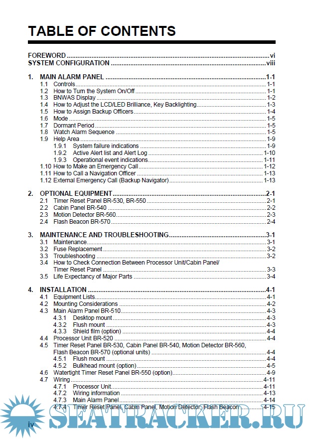 Description: Operators manual for the Furuno BR500 BNWAS, which monitors the watch officer's presence through watch safety system functions. A watch officer is required to press the button on a Timer Reset Panel or to operate navigation equipment at certain preset intervals. If the officer fails to press the button, operate connected equipment or trigger optional motion sensors within preset intervals, visual and audible alarms will be generated in the wheelhouse. If the officer doesn't respond to the alarm, the BR500 transfers the alarm to the Cabin Panels installed in other sections of the vessel in order to inform backup officers of the watch officer's incapacity.