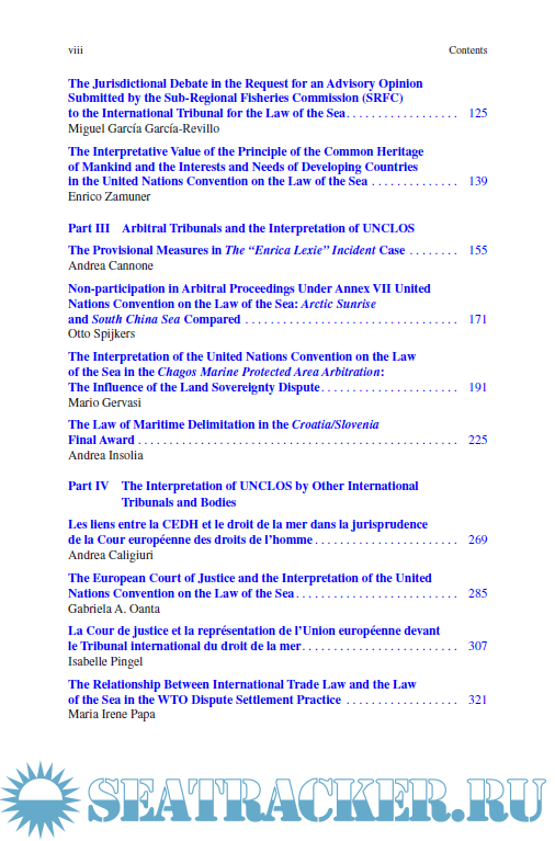 Description: This book addresses current developments concerning the interpretation of the United Nations Convention on the Law of the Sea (UNCLOS) on the part of international courts and tribunals. It does so from different perspectives, by focusing on the jurisprudence of international and regional bodies, such as the International Court of Justice (ICJ), the International Tribunal for the Law of the Sea (ITLOS), the European Court of Justice (ECJ) and the European Court of Human Rights (ECtHR), as well as international arbitral tribunals and the World Trade Organization (WTO) Dispute Settlement Body.
