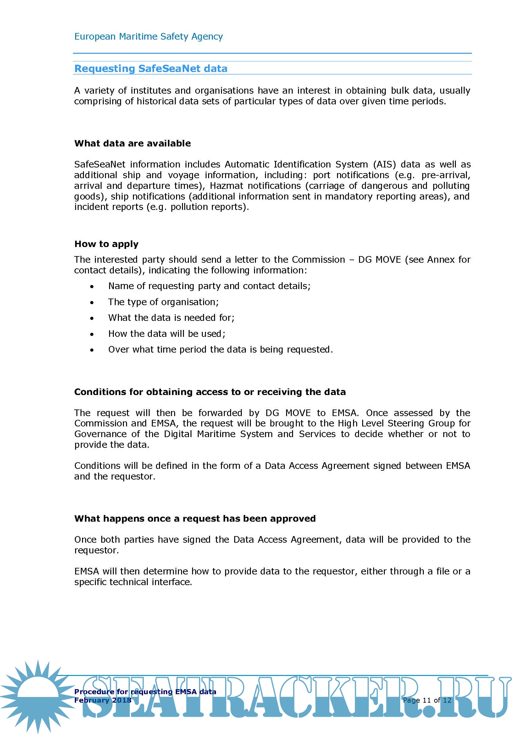 Year: 2018 Language: english Author: EMSA Genre: Guide Format: PDF Quality: eBook Pages count: 12 Description: The purpose of this document is to indicate the different procedures which have been established by the European Maritime Safety Agency (EMSA) to manage external requests for data from the EMSA applications (including Long Range Identification and Tracking [LRIT], SafeSeaNet, CleanSeaNet and Satellite AIS data). These requests are made by European Union (EU) Member State national government authorities and EU institutions and bodies, and by projects or programmes established by these parties and working on issues of public interest. For each specific data type, a different procedure is applied. The applicable procedures are described in this document, which provides the following information: What data are available; How to apply; Conditions for obtaining access to or receiving the data; What happens once a request has been approved.