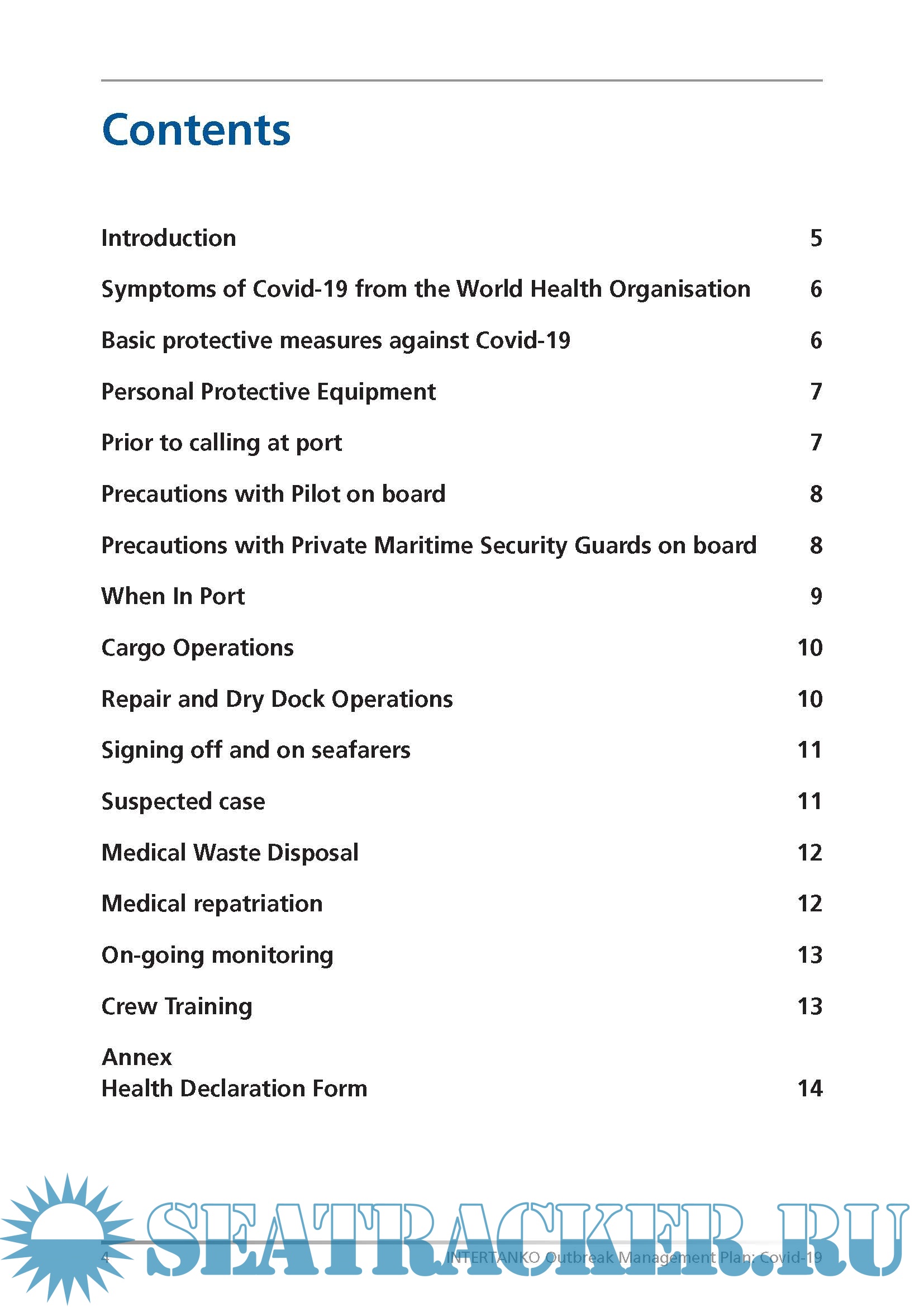 Year: 2020 Language: english Author: INTERTANKO Genre: Guide Format: PDF Quality: eBook Pages count: 16 Description: This document outlines the plans and procedures to be put in place to prepare a ship for shore personnel to come on board and to protect seafarers from the dangers posed by the new Coronavirus disease (Covid-19). This includes potential exposure from shore personnel and the actions to take in the event of a suspected case on board. This guidance should be read in conjunction with the International Chamber of Shipping (ICS)- published Coronavirus (Covid-19) Guidance for Ship Operators for the Protection of the Health of Seafarers.