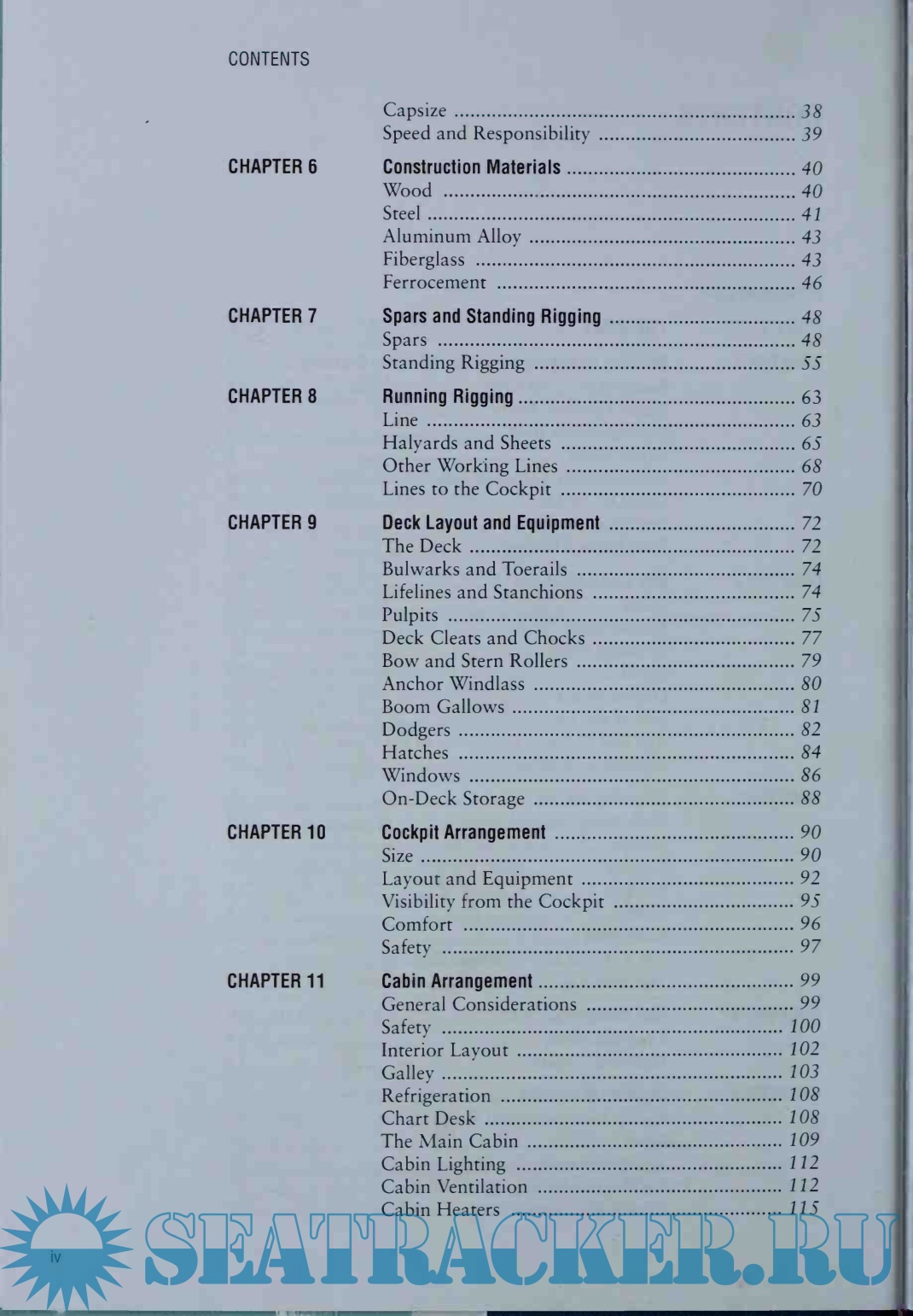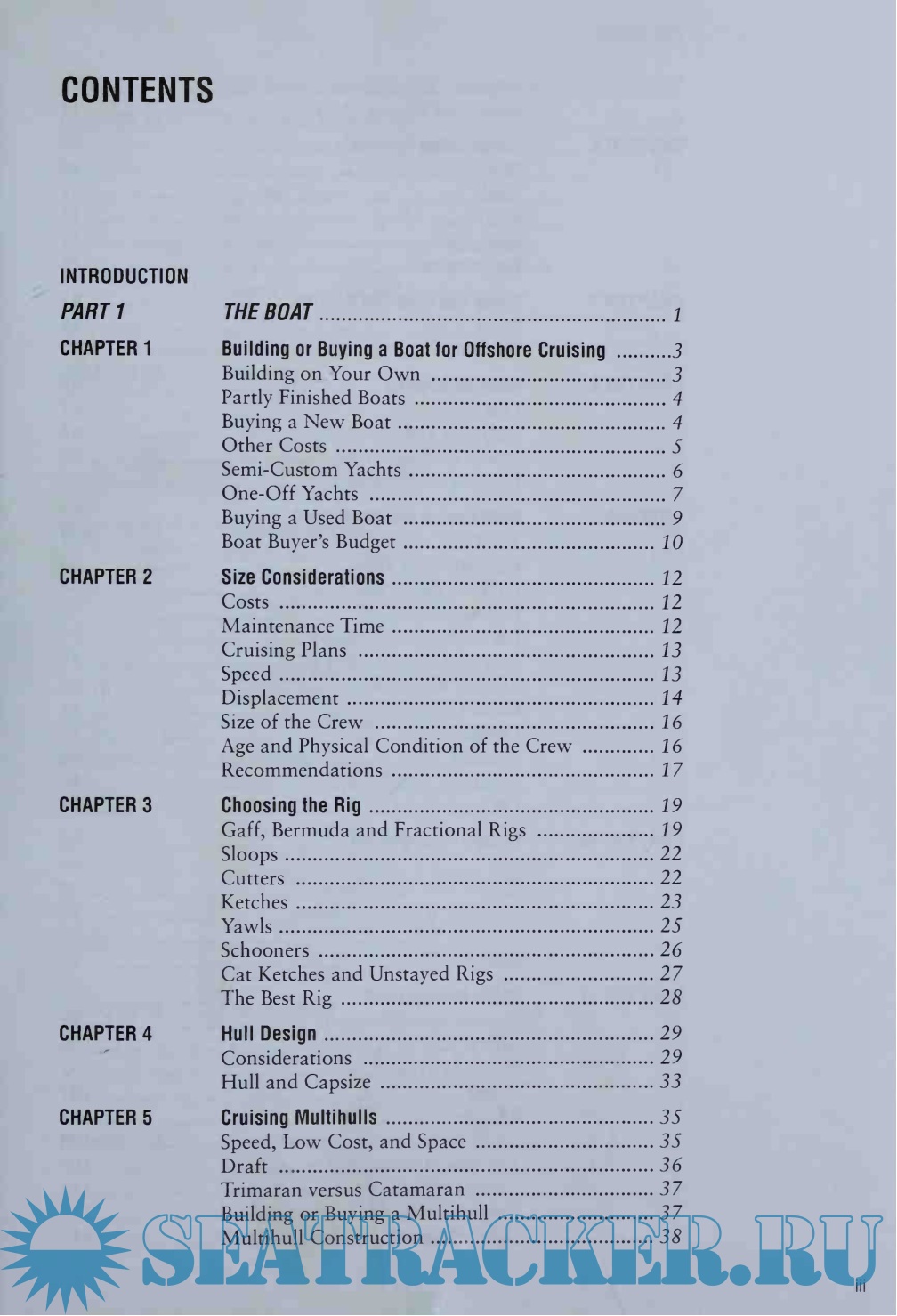 Part 1, The Boat, consists of eleven chapters, ranging from building or buying a boat and choosing the rig to construction materials and deck, cockpit and cabin layout.