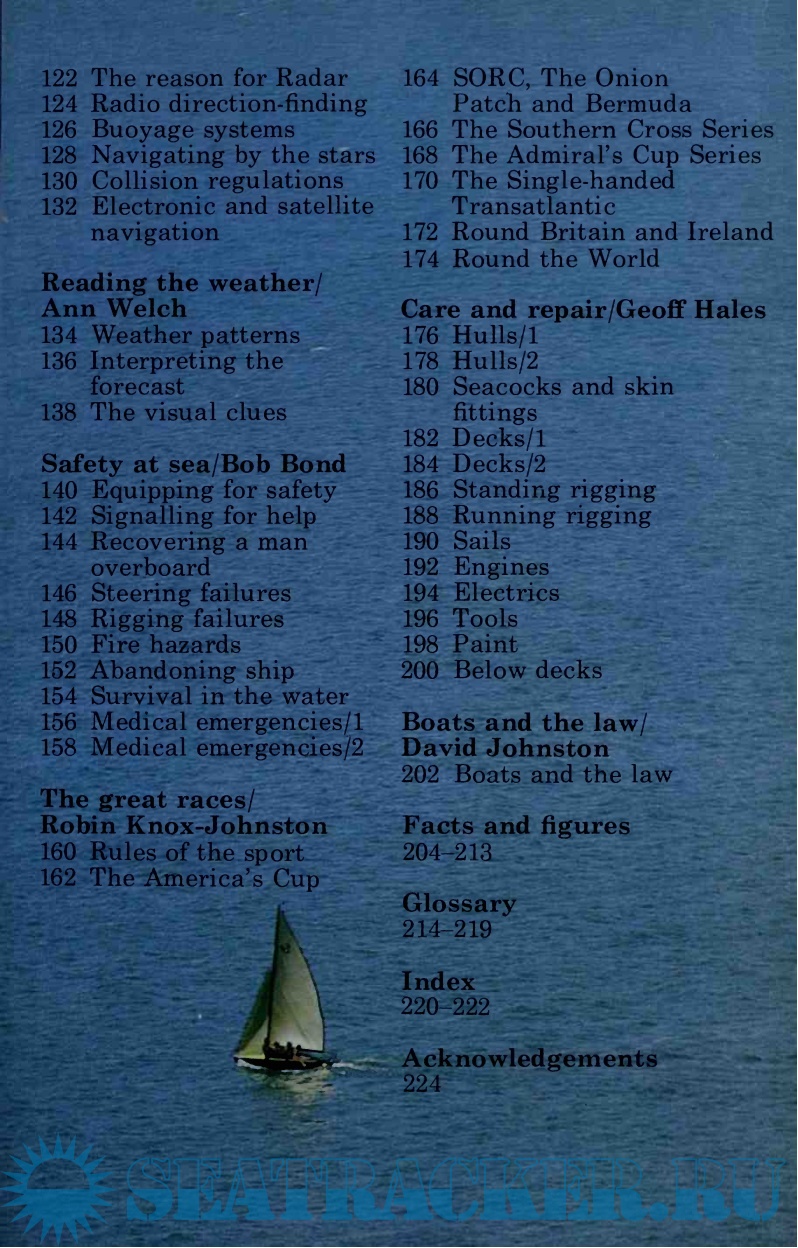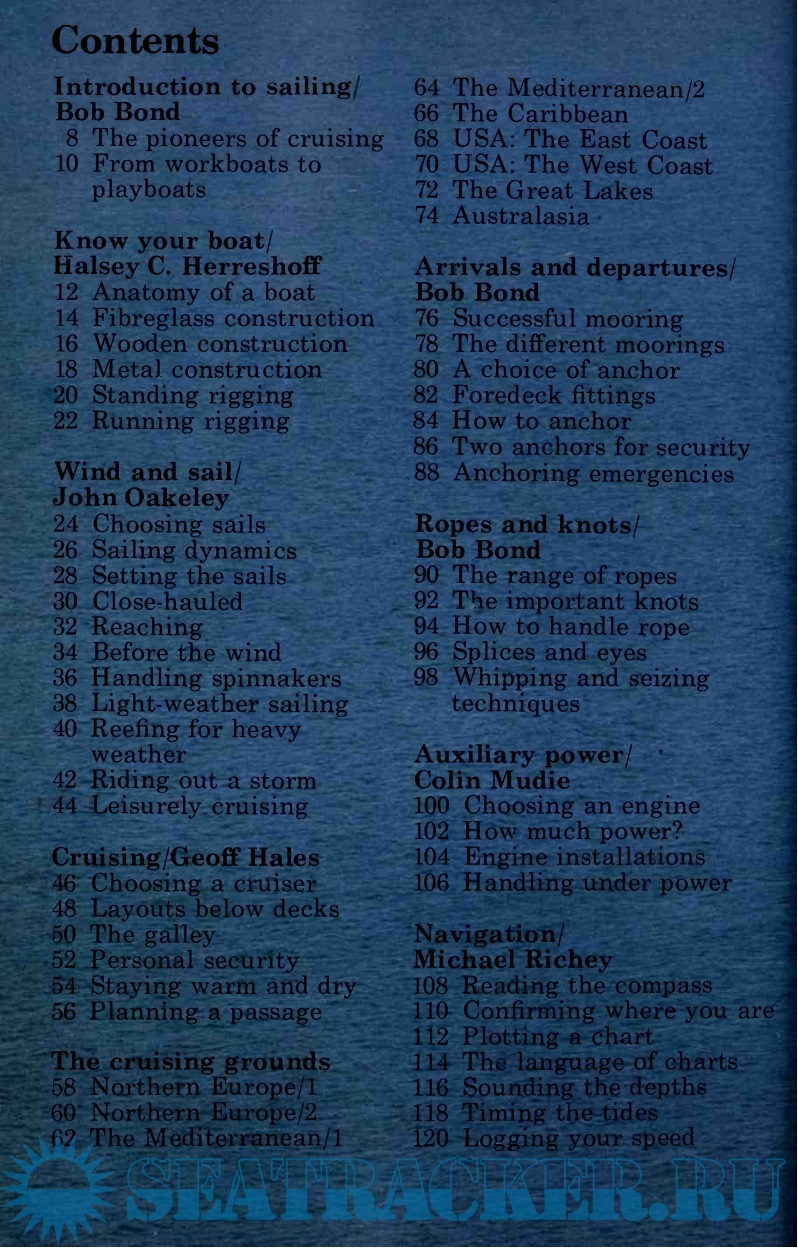 Year: 1994 Language: english Author: Herreshoff H.C., Mudie C., Oakeley J. (ed.) Genre: Handbook Publisher: Little, Brown & Co ISBN: 0-316-35948-3 Format: PDF Quality: Scanned pages Pages count: 225 Description: The chronicling of the development of yachting is as incomplete as the history of the evolution of man. It was only when a few amateur sailors began to publish books for the entertainment and education of others that more people became aware that cruising, as opposed to racing, could be enjoyed by ordinary 'landsmen'. Perhaps the most influential volume was Claude Worth's 1910 classic, Yacht Cruising. The craft most readily available to the 'landsmen' were invariably commercial boats nearing the end of their useful working days, but which, with the addition of simple sleeping accommodation, often ex-navy hammocks, and the conversion of the fish-hold into a spacious saloon, made excellent cheap cruising boats. Many longshore fishermen were employed as professional summer crews by the world's elite. When these men returned home to their fishing villages, they passed on equipment details and accommodation plans to local boatbuilders engaged in converting fishing boats to yachts. The process has continued to the present day: the classic British motorsailers were derived from the Scottish double-ended fishing boats. The broadbeamed, square-sterned American motur yachts were based on the Gulf prawners and Alaskan salmon seiners, and the sleek Scandinavian yachts owe much to the Viking long boats and the sailing lifeboats, redningskoites. designed by the legendary Colin Archer. Just as previous generations produced famous navigators and explorers, so the last century has given yachting its own pioneers: men who in their time were 'oddballs', some celebrated, others known only because of their writings. Those who cruised the oceans single-handed were probably held in the same awe that we reserve for those who have been to the moon.