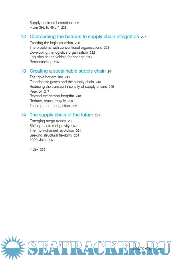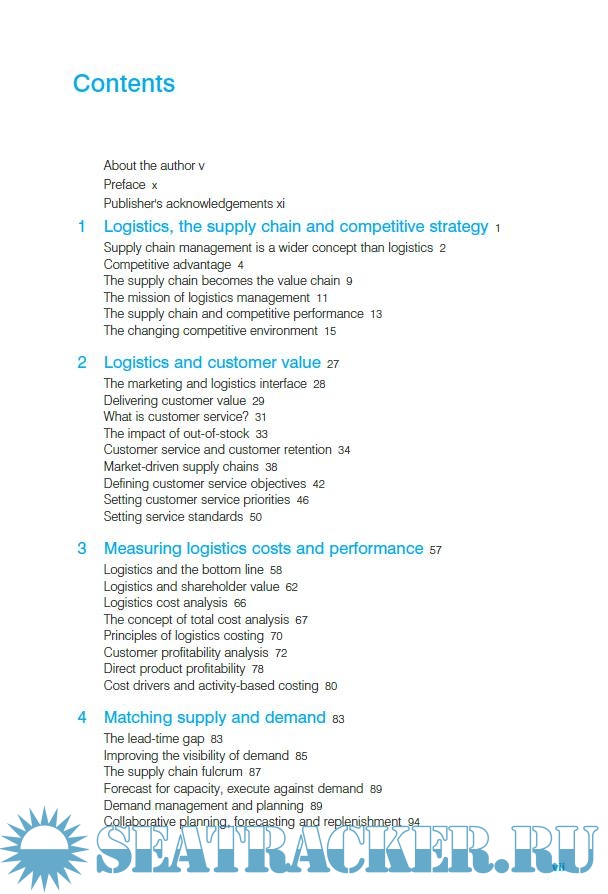 Year: 2011 Language: english Author: Christopher, Martin Publisher: Financial Times - Prentice Hall Edition: Fourth ISBN: 978-0-273-73112-2 Format: PDF Quality: eBook Pages count: 288 Description: According to the preface made by the author, when the first edition of this book was published in 1992, supply chain management as an idea was still in its infancy and relatively few companies had made it a priority. The same was true for logistics management, although its precursor, distribution management, was increasingly being recognised as important, both in terms of cost and for its potential impact on sales. In the intervening years from the first to the fourth edition, many things have happened. Firstly, there is now a much greater understanding of the role that supply chain management plays in creating competitive advantage. Whereas previously the focus was primarily tactical with a concern for optimising costs, now there is much more of a strategic focus with the emphasis on value creation and delivery. The second major change is the recognition that supply chain management is not just an extension of logistics management, but rather that it is about managing relationships across the complex networks that today's supply chains have become. A third significant change over that period is that the business environment has become a lot more volatile and hence less predictable. This transition from a relatively stable world to one that is much more turbulent requires supply chains to be capable of changing rapidly to meet changed circumstances. These changes are reflected in the additional material included in this 4th edition. Thus, complexity management and the challenge of making the transition from a forecast-driven to a demand-driven business model are given greater emphasis. This book is a classic textbook for many Universities in the field of “Logistics and Supply Chain Management” in which shipping of goods by whatever means is involved.