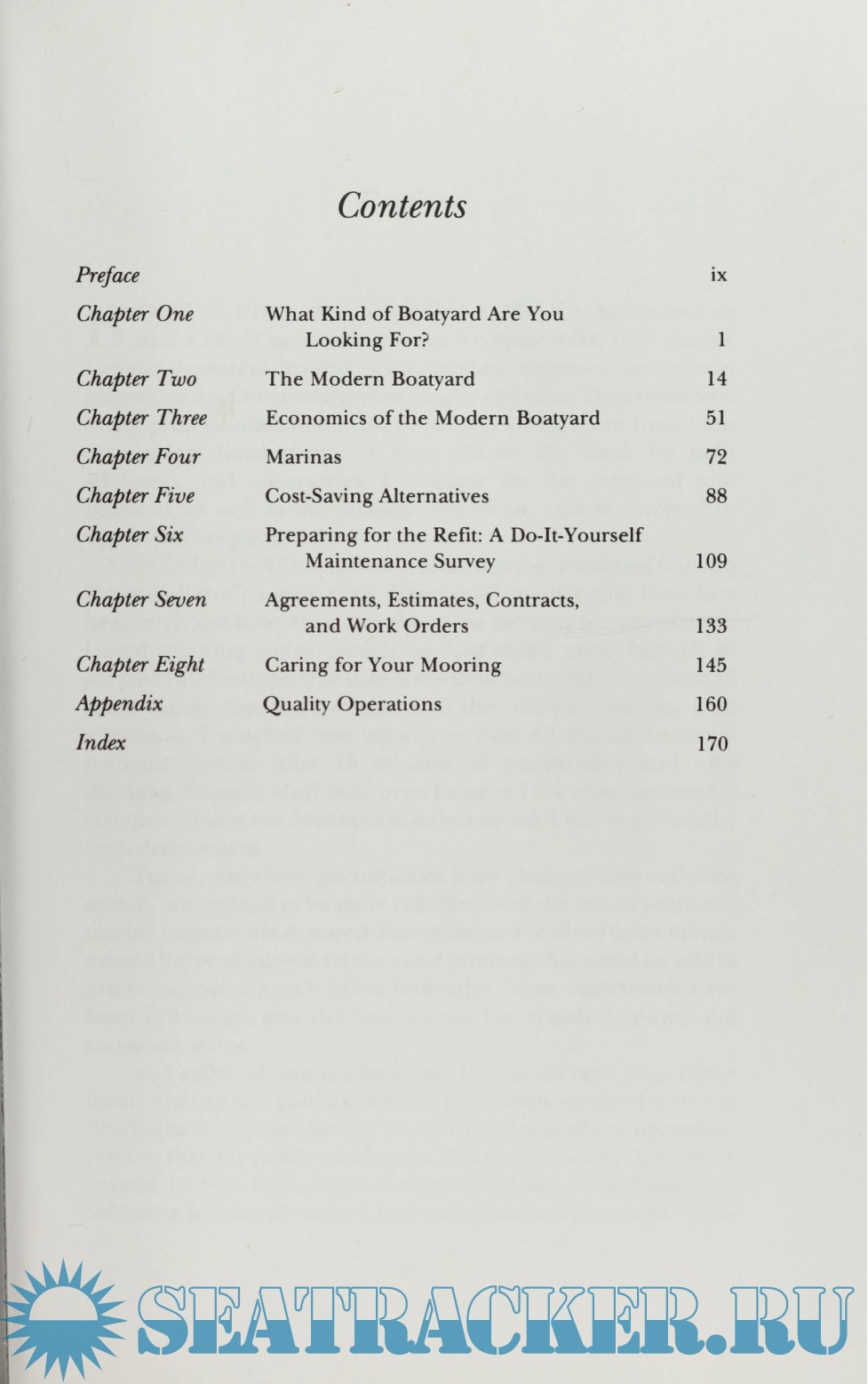 Year: 1988 Language: english Author: Naranjo R.J. Genre: Guide Publisher: International Marine Publications Co ISBN: 0-87742-962-6 Format: PDF Quality: Scanned pages Pages count: 188 Description: It you own a powerboat or sailboat more than 20 feet long, chances are you've already made the acquaintance of a boatyard or marina. Your needs may be simple — a place to berth in the summer or haul out in the winter. Or perhaps you're in the market for a new paint job, an engine overhaul, or major structural repairs. Whatever your needs, this one-of-a- kind guide will help you get the best care for your boat by using your time and money effectively. Author Ralph Naranjo, a boatyard manager as well as a boat owner himself, begins by helping you evaluate your priorities and skill levels to decide what kind of boatyard you really need. For some mechanically inclined owners, a no-frills, do-it-yourself yard is a real bargain; for others, it is a false economy. Knowing what you're looking for, Naranjo feels, is halfway to getting there. He then takes you on an in-depth tour of the modern boatyard, describing the equipment you'll find in use and offering helpful guidelines for evaluating competence. Typical haulout and storage packages are compared — right down to the fine print — and there are important tips on contracts, estimates, and work orders that can substantially reduce your yard bills while ensuring more pleasant working relationships with the boatyard staff. For the do-it-yourself minded, Naranjo thoroughly details winterization procedures, offers an extensive annual maintenance survey, and has several helpful suggestions on cost-effective alternatives. Naranjo applies this same careful scrutiny to marinas. Whether you're stopping overnight or looking for a permanent home for your boat, he'll help you choose the best facility for your needs, weighing safety and social concerns against economic ones. Regional differences are taken into consideration, and there's also a glimpse of future trends, including dockominiums and slip ownership. Naranjo's own comments are supplemented by a detailed survey of boatyard owners from coast to coast. Experts claim that the average boat owner should figure on investing 5 to 10% of the purchase price of a boat in its annual storage and upkeep. In view of the considerable outlay of time and money involved, there has long been a need for a book that tells you how to make this investment wisely. Here it is.