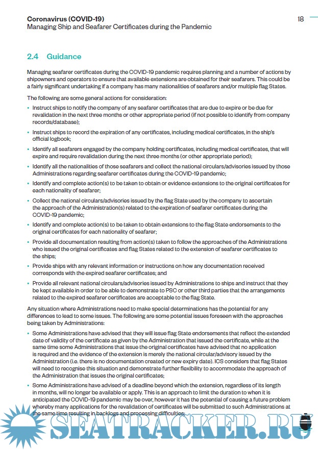 Year: 2020 Language: english Author: ICS Format: PDF Quality: eBook Pages count: 21 Description: This guidance provides information for shipowners and operators on managing ship and seafarer certificates during the Coronavirus (COVID-19) pandemic. It covers ship and seafarer certificates required by the certification provisions of international regulations, such as those of International Maritime Organization (IMO) and International Labour Organization (ILO) instruments, and highlights the current unique compliance issues and considerations relating to ship and seafarer certificates.