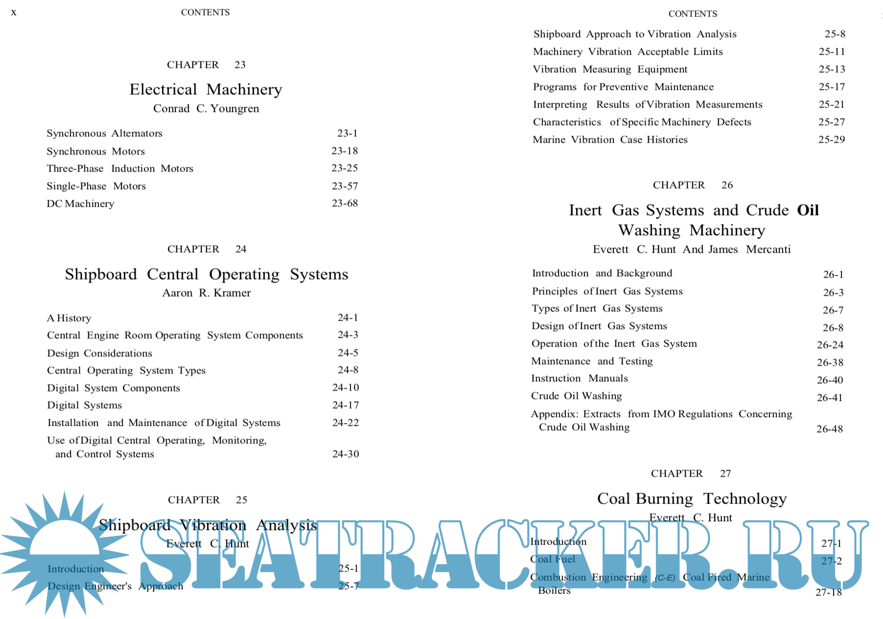 new manual prepared in the tradition ofthe first edition. In addition to the shipboard auxiliary machinery of the first edition, this edition places special and appropriate emphasis on diesel main propulsion, cargo sys- tems, central operating systems, and vibration analysis as a monitoring and maintenance tool. A chapter on combustion of coal has been included in anticipation of a renewed interest in this fuel.