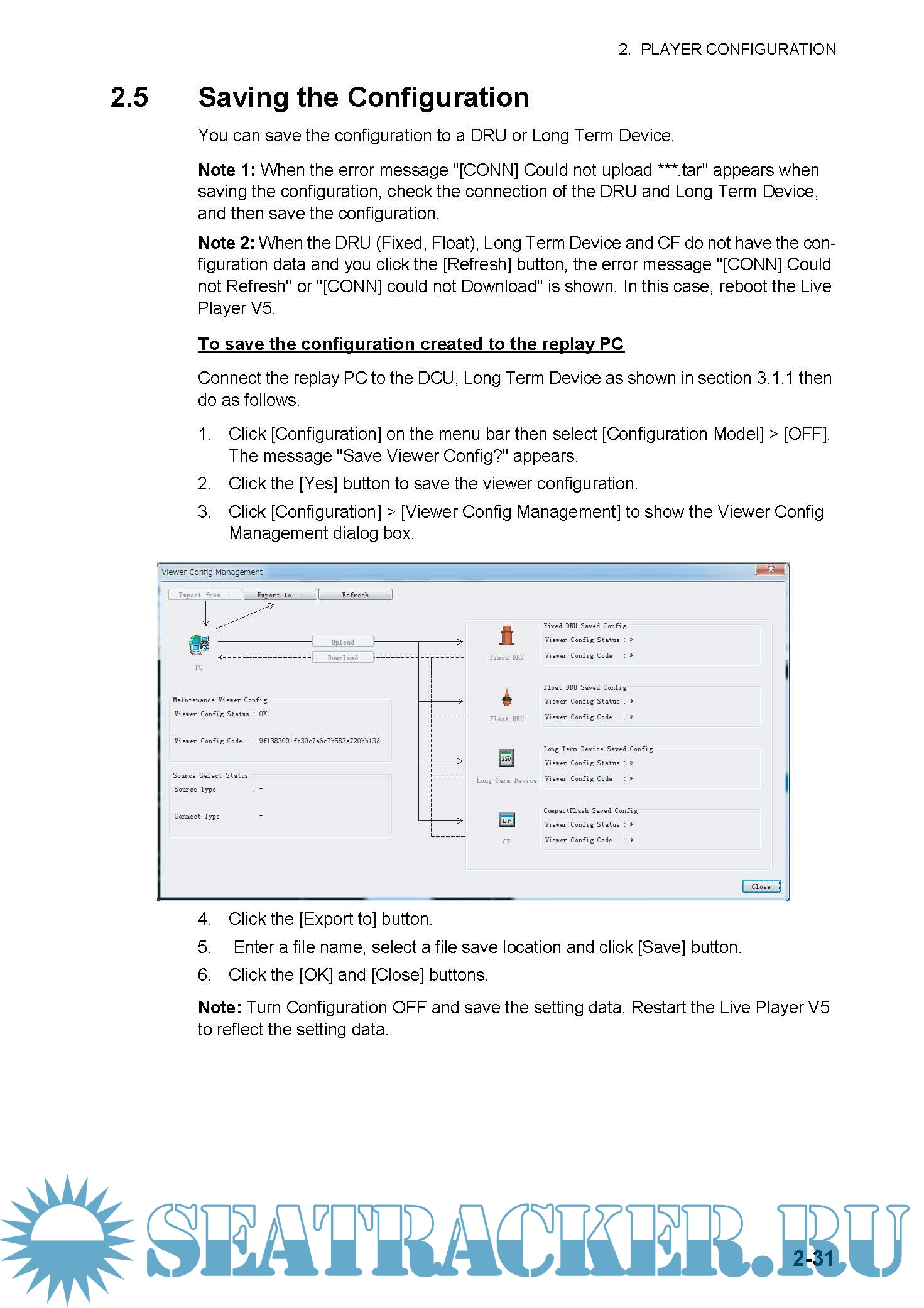 Year: 2014 Language: english Author: Furuno Genre: Manual Format: PDF Quality: eBook Pages count: 91 Description: Live Player V5 is a software program that installs in a PC, and functions to monitor and playback the data collected in the VR-7000’s DRU, Long Term Device. Notes on usage Observe the notices shown below to prevent malfunction. • Do not connect the Live Player to a DRU (Fixed, Float-free) when the DRU is connected to the DCU. Also, do not attempt to extract data in the above-mentioned condition. • The Live Player of the VR-3000 is not compatible with the VR-7000. Do not use it with the VR-7000. • The screenshots shown in this manual were taken on a Windows®7 based PC. The screens you see may be different depending on PC’s OS.