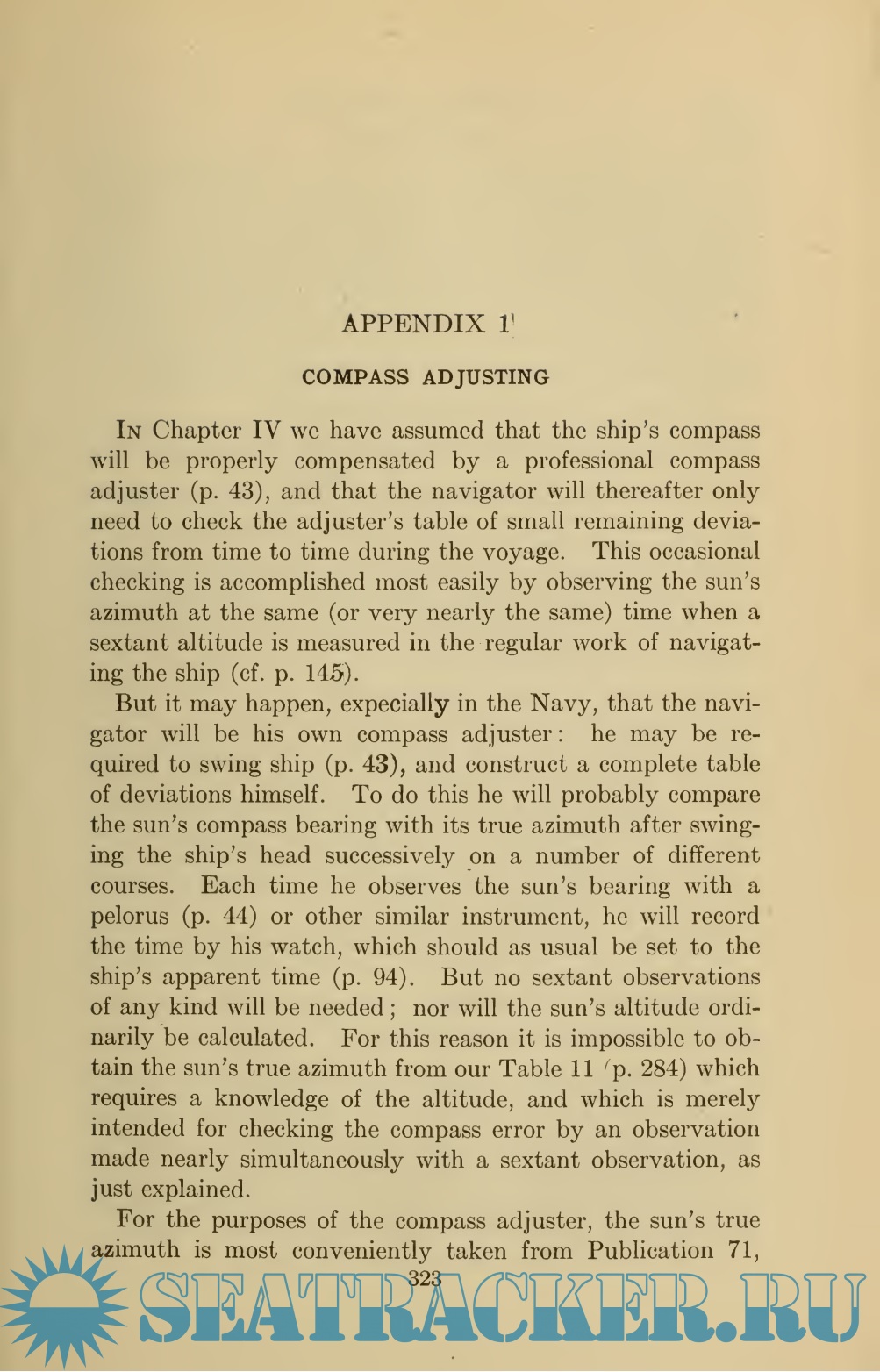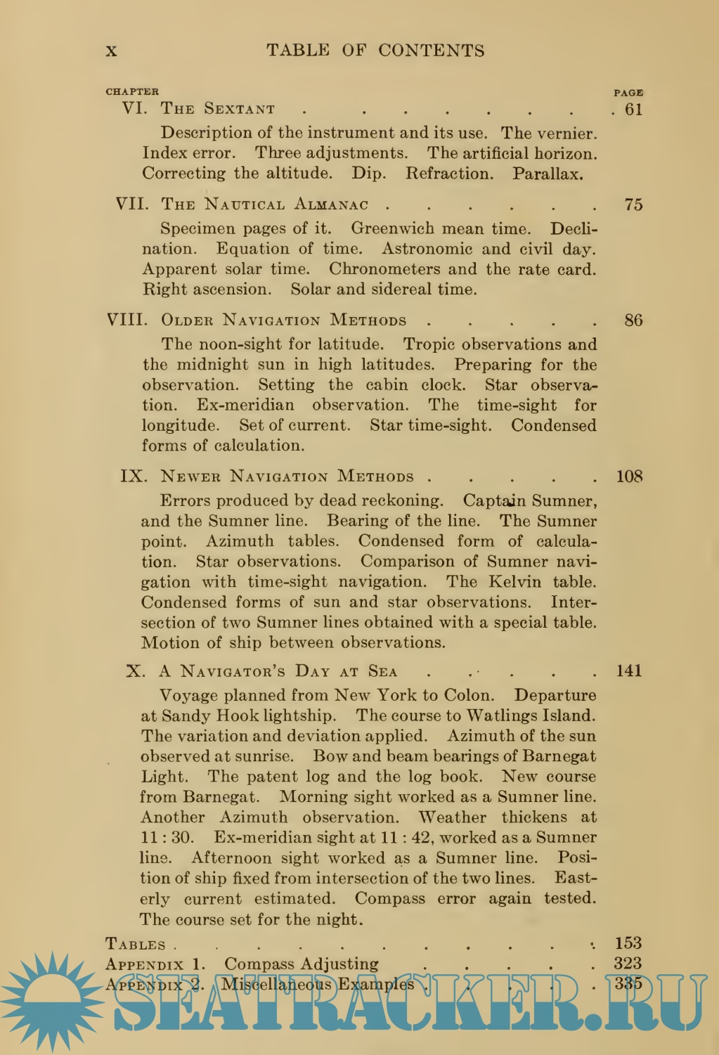Year: 1918 Language: english Author: Harold Jacoby Genre: Handbook Publisher: The McMillan Company Edition: 2nd Format: PDF Quality: Scanned pages Pages count: 376 Description: The present volume was undertaken with certain very definite aims. In the first place, it is intended to be complete in itself, so that it should be possible to navigate a ship in any ocean not very near the north or south pole without other books or tabular works, excepting only the nautical almanac for the year in which the voyage is made. To attain this end without unduly extending the size of the volume, certain essential nautical tables have been abridged ; but all are given in sufficiently extended form to permit of actual navigation with their aid ; and they are especially suitable for beginners, who can here attain the necessary knowledge with less effort than would be necessary with more bulky volumes. In cases where very extended tables are convenient, they are mentioned in the text. In the second place, the author has not assumed that the reader possesses formal mathematical and astronomical knowledge, or desires to possess such knowledge. Whenever methods of navigation require for their demonstration an understanding of spherical trigonometry, or some other branch of formal mathematical science, such demonstrations have been replaced with incomplete or ''outline " demonstrations designed for the non-mathematical reader. Practical methods are fully explained ; and an attempt has always been made so to word the explanations that the reader, even the beginner, will understand his problem, and will know what he is doing, and why he does it.