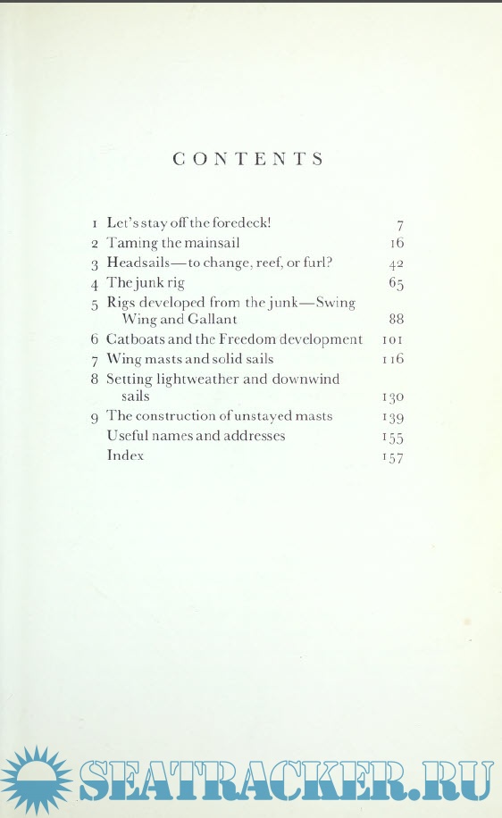 Year: 1986 Language: english Author: John Campbell Genre: Handbook Publisher: MOLLIS & CARTER Edition: First ISBN: 0-370-30698-8 Format: PDF Quality: Scanned pages Pages count: 161 Description: The most serious danger that we face when cruising on a sailing boat is falling overboard. This risk is probably at its greatest when we are on a pitching foredeck, perhaps during a dark and windy night, wrestling with a flapping sail that needs to come down. People persist in working on deck when it is possible to arrange all sailhandling to be done from the safety of the cockpit. When all the sails can be easily handled without anybody going on deck, the crew are less likely to get wet and tired, or fall overboard, and more likely to enjoy themselves. We are supposed to go sailing for pleasure! The moment one leaves the cockpit to go on deck, the risk of falling overboard is greatly increased, and once over the side, the chances of recovery are frighteningly small. One piece of equipment that might well help in this type of situation would be some form of self steering. This used to be considered as gear required only for transocean passages, yet some form of self steering can make life so much easier aboard any boat, even one undertaking only modest coastal passages.