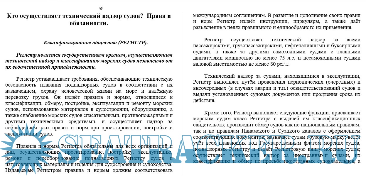 Вопросы с 1 по 50 1. РАДИОДЕВИАЦИЯ. ПОЧЕМУ ОНА ПОЯВЛЯЕТСЯ? 2. ЧТЕНИЕ АНГЛИЙСКИХ МОРСКИХ КАРТ И КНИГ? 3. ДЕЙСТВИЯ КОГДА ЯКОРЬ НЕ ДЕРЖИТ? 4. ИЗОЛИРУЮЩИЕ ДЫХАТЕЛЬНЫЕ АППАРАТЫ, РЕСПИРАТОРЫ, ПРОТИВОГАЗЫ, ПРИНЦИП ДЕЙСТВИЯ, НАЗНАЧЕНИЕ. 5. КАК ПОДРАЗДЕЛЯЮТСЯ РАЗЛИВЫ.КАКИЕ РАЗЛИВЫ АВАРИЙНЫЕ, КАКИЕ ЭКСПЛУАТАЦИОННЫЕ. 6. КАКИЕ ДОКУМЕНТЫ ВЫДАЁТ СЛУЖБА КАПИТАНА ПОРТА 7. КАКИЕ ДОПОЛНИТЕЛЬНЫЕ ДОКУМЕНТЫ ДОЛЖНО ИМЕТЬ СУДНО 8. КАКИЕ НОРМАТИВНЫЕ ДОКУМЕНТЫ ДОЛЖНЫ БЫТЬ НА СУДНЕ. 9. КАКИЕ ПЕРВИЧНЫЕ И ДОПОЛНИТЕЛЬНЫЕ ДЕЙСТВИЯ ОСУЩЕСТВЛЯЕТ ЭКИПАЖ СУДНА В СЛУЧАЕ АВАРИЙНОГО РАЗЛИВА НЕФТИ 10. КАКИЕ СУДОВЫЕ ДОКУМЕНТЫ ВЫДАЁТ ИНСТИТУЦИЯ, КОТОРАЯ ОСУЩЕСТВЛЯЕТ ТЕХНИЧЕСКИЙ НАДЗОР СУДНА. 11. КАКУЮ ДЕВИАЦИЮ ВЫЗЫВАЕТ МЯГКОЕ И ТВЁРДОЕ СУДОВОЕ ЖЕЛЕЗО 12. НА КАКОМ РАССТОЯНИИ ОТ БЕРЕГА ТАНКИ ПРОМЫВАЮТСЯ ТОЛЬКО ЗАКРЫТЫМ СПОСОБОМ 13. ОСОБЕННОСТИ УПРАВЛЕНИЯ СУДНОМ В ШТОРМОВУЮ ПОГОДУ 14. ПОГРЕШНОСТИ ГИРОКОМПАСА, ИХ ТИПЫ. 15. ПОНЯТИЕ ГИРОСКОПА. 16. ПРАВИЛА ТЕХНИКИ БЕЗОПАСНОСТИ ПРИ РАБОТЕ С ЭРНП 17. ПРОТИВОПОЖАРНЫЕ ПРОФИЛАКТИЧЕСКИЕ МЕРОПРИЯТИЯ ПРИ БУНКЕРОВКЕ СУДНА. 18. РАДИОПЕЛЕНГАТОРЫ И ПРИНЦИП ИХ ДЕЙСТВИЯ. 19. СОСТАВ ГИРОКОМПАСА. 20. СПОСОБЫ МАНЕВРИРОВАНИЯ ПРИ УНИЧТОЖЕНИИ ДЕВИАЦИИ МАГНИТНОГО КОМПАСА. 21. ТЕХНИКА БЕЗОПАСНОСТИ ПРИ ОБСЛУЖИВАНИИ ЭЛЕКТРООБОРУДОВАНИЯ. 22. ТЕХНИКА БЕЗОПАСНОСТИ ПРИ ШВАРТОВЫХ ОПЕРАЦИЯХ. 23. УПРАВЛЕНИЕ СУДНОМ В ПРОЛИВАХ, ШХЕРАХ. 24. ЧТО НАЗЫВАЕМ ОСТАТОЧНОЙ ДЕВИАЦИЕЙ. 25. ЧТО НАЗЫВАЕТСЯ МАГНИТНЫМ МЕРИДИАНОМ И МАГНИТНЫМ СКЛОНЕНИЕМ. 26. ЗВЁЗДНЫЙ ГЛОБУС.КАКИЕ ЗАДАЧИ РЕШАЮТСЯ С ЕГО ПОМОЩЬЮ 27. БУКСИРНОЕ УСТРОЙСТВО 28.ПЕРЕВОЗКА ГРУЗОВ НА ПАЛУБАХ. 29. КАКИЕ ДАННЫЕ О ПРИЛИВАХ-ОТЛИВАХ УКАЗЫВАЮТСЯ НА КАРТАХ. 30. КАК ОПРЕДЕЛИТЬ МОМЕНТЫ И ВЫСОТУ ВОДЫ В ОСНОВНЫХ И ВТОРОСТЕПЕННЫХ ПУНКТАХ. 31. КАКУЮ ПОГРЕШНОСТЬ ИМЕЕТ СЕКСТАН. КАК ПРАКТИЧЕСКИ ИХ УСТРАНЯЮТ. 32. КОНСТРУКЦИЯ КОРПУСА СТАЛЬНОГО СУДНА. 33. ОПРЕДЕЛЕНИЕ МЕСТА СУДНА С ПОМОЩЬЮ РЛС.ЧТО ОПРЕДЕЛЯЕТ ТОЧНОСТЬ ОПРЕДЕЛЕНИЯ МЕСТА, ИХ ЗНАЧЕНИЕ. 34. ОПРЕДЕЛЕНИЕ МЕСТА СУДНА ПО ЗВЁЗДАМ. 35. ПОНЯТИЕ О ПРОЧНОСТИ КОРПУСА СУДНА. 36. ПОЯСНОЕ, ДИСКРЕТНОЕ И СУДОВОЕ ВРЕМЯ 37. РУЛЕВОЕ УСТРОЙСТВО 38. СУДОВЫЕ ПОМЕЩЕНИЯ.ПРИНЦИПИАЛЬНАЯ СХЕМА ВНУТРЕННЕГО УСТРОЙСТВА СУДНА. 39. ПЕРЕВОЗКА ОПАСНЫХ ГРУЗОВ. 40. ШВАРТОВНОЕ УСТРОЙСТВО 41. ЯКОРНОЕ УСТРОЙСТВО 42. КАКИЕ ЛИЦА ПО ПРАВИЛАМ ВЫДАЧИ ДИПЛОМОВ, КОДЕКСА МОРЕПЛАВАНИЯ, МОГУТ ЗАНЯТЬ ДОЛЖНОСТЬ КАПИТАНА, ПОМ. КАПИТАНА, СУДОМЕХАНИКА, ЭЛЕКТРОМЕХАНИКА И РАДИОСПЕЦИАЛИСТА. 43. ПОТЯТИЯ (ДЕМЕРЕДЖ, ДИСПАЧ) 44. КАКИЕ МЕРЫ МОЖЕТ ПРЕДПРИНЯТЬ КАПИТАН, ЕСЛИ ЧЛЕНЫ ЭКИПАЖА НЕ ВЫПОЛНЯЮТ ЕГО ЗАКОННЫЕ ТРЕБОВАНИЯ. 45. КАКИЕ СВЕДЕНИЯ ВКЛЮЧАЮТСЯ В СУДОВОЙ ПЛАН БОРЬБЫ С РАЗЛИВАМИ НЕФТИ. 46. КОМУ СООБЩАЕТСЯ И С КЕМ ПОДДЕРЖИВАЕТСЯ ПОСТОЯННАЯ СВЯЗЬ ПРИ РАЗЛИВЕ НЕФТЕПРОДУКТОВ ЗА БОРТ? 47. КООРДИНАЦИЯ НА МЕСТЕ ДЕЙСТВИЯ. 48. КТО КООРДИНИРУЕТ ОПЕРАЦИИ ПО ПОИСКУ И СПАСЕНИЮ. 49. ОБЯЗАННОСТИ ГРУЗООТПРАВИТЕЛЯ И ПЕРЕВОЗЧИКА. 50. ОПРЕДЕЛЕНИЯ ИСПОЛЬЗУЕМОЙ ТЕРМИНОЛОГИИ МСС. Вопросы с 51 по 100 51. ОФОРМЛЕНИЕ НЕСЧАСТНЫХ СЛУЧАЕВ НА СУДАХ. 52. ОПРЕДЕЛЕНИЕ УГЛА КРЕНА И ДИФЕРЕНТА ПО ФОРМУЛАМ. 53. КТО ОСУЩЕСТВЛЯЕТ ТЕХНИЧЕСКИЙ НАДЗОР СУДОВ? ПРАВА И ОБЯЗАННОСТИ. 54. СОСТАВЛЕНИЕ ГРУЗОВОГО ПЛАНА. 55. СХЕМА РЕКОМЕНДОВАННЫХ ПУТЕЙ. 56. СЧИСЛЕНИЕ ПУТИ СУДНА С УЧЁТОМ ВЕТРА, ТЕЧЕНИЕ. 57. ПОДДЕРЖАНИЕ ОСТОЙЧИВОСТИ ПРИ ПОГРУЗКЕ И РАЗГРУЗКЕ. 58.СПОСОБЫ ПРОВЕРКИ ПОДДЕРЖАНИЯ ОСТОЙЧИВОСТИ СУДНА. 59. ДОКУМЕНТЫ, ПРЕДНАЗНАЧЕННЫЕ ДЛЯ КАПИТАНА ПО СОХРАНЕНИЮ ОСТОЙЧИВОСТИ И ЖИВУЧЕСТИ СУДНА. 60. УСЛОВИЯ ТРУДА НА СУДН