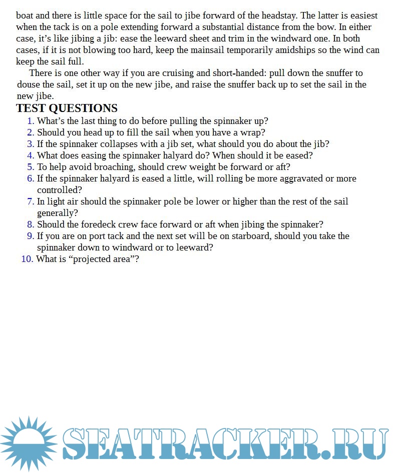 Preface 1. SAILS Sails and Sail Shape Draft Sail Construction How To “See” Sail Shape Proper Jib Adjustment Test Questions 2. BOAT HANDLING Heeling Tacking Jibing Light-Air Sailing Heavy-Air Sailing Winging the Jib Test Questions 3. BALANCE AND APPARENT WIND Balance Apparent Wind Test Questions 4. SPINNAKER WORK When to Fly It The Set Spinnaker Trim Halyard Ease Light-Air Spinnaker Work Jibing the Spinnaker Dousing the Spinnaker Common Spinnaker Mistakes and Problems Spinnaker Broaching Rolling or Oscillating Asymmetrical Spinnakers Trimming Asymmetrical Spinnakers Jibing Asymmetrical Spinnakers Test Questions 5. POLAR DIAGRAMS Test Questions 6. BASIC RACING The Start Crew Duties during a Race Input Considerations for the Skippe Starting Tactics Special Starts Test Questions 7. RACING TACTICS Clear Air Covering Breaking Cover The Finish Racing Rules Test Questions 8. OTHER RACING TIPS Steering Concentration Experiences Preparation Light-Air Sailing Current Safety Test Questions 9. SAFETY AND EMERGENCIES Observing Weaknesses Handling Emergencies Squalls Groundings Distress Signals Collisions Test Questions Answers to Test Questions Glossary Index