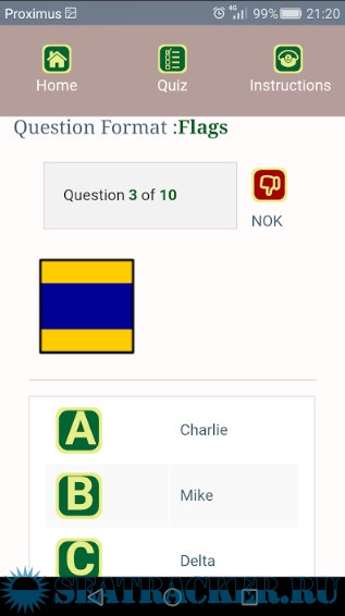 Here you can test your knowledge with a series of 10 questions. You can choose questions on flags, messages or Morse codes. Start with flags and then go on to messages and later Morse code. You can always come back to this section to test your actual knowledge.