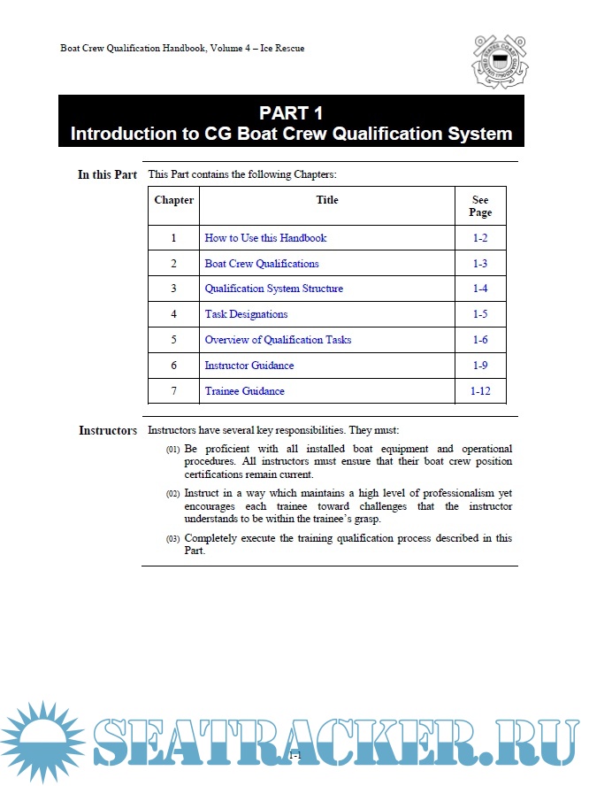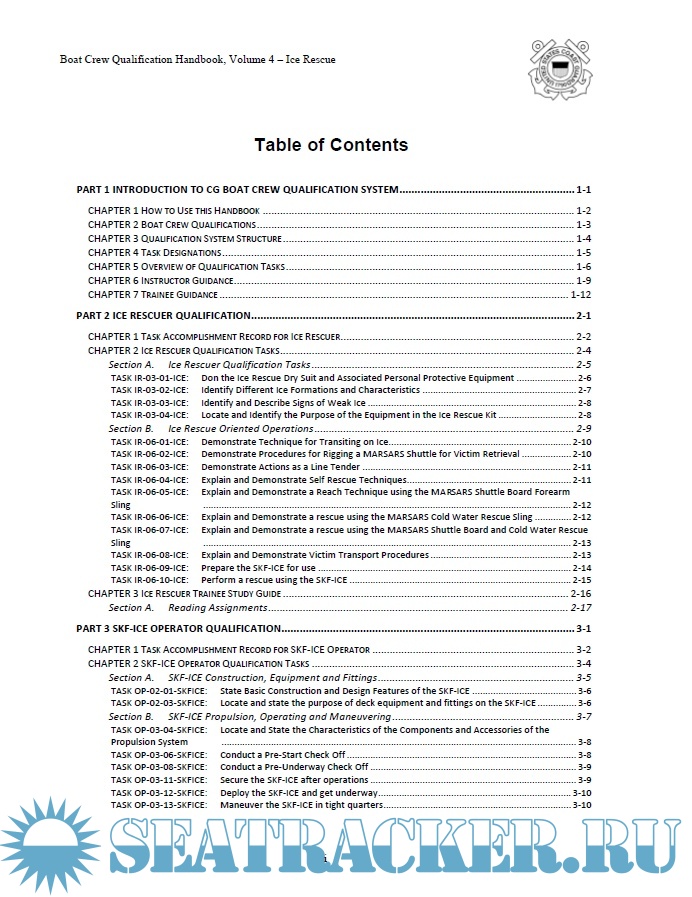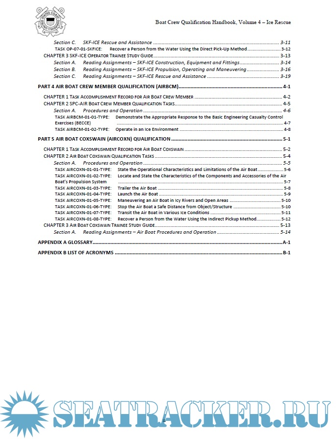 Year: 2020 Language: english Author: US Coast Guard Genre: Handbook Format: PDF Quality: eBook Pages count: 94 Description: Boat Crew Qualification Handbooks describe policy, standards, instructions, procedures and guidance for the purpose of training, qualifying and certifying personnel to operate on Coast Guard boats. These four volumes are the up-to-date natural complement to the "Boat Crew Handbook", vol 1-5. Volume 4, Ice Rescue provides standardized performance objectives and guidance for the purpose of training and certifying personnel Coast Guard Ice Rescuer on Coast Guard boats. Refer to Content for specific information about topics.