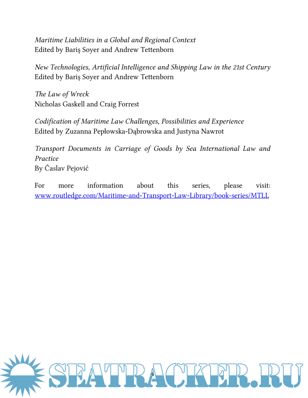Year: 2020 Language: english Author: Časlav Pejović Genre: Handbook Publisher: Informa Law from Routledge Edition: 1 ISBN: 9780429197130 Format: PDF Quality: eBook Pages count: 567 Description: Transport documents used in carriage by sea, and particularly bills of lading, have been the subject of numerous books. Then, why another book on this topic? This book brings a fresh, comparative approach to transport documents used in the carriage of goods by sea. In addition to English law, which dominates this area, the book covers a number of jurisdictions, such as American, French, Italian, German and several Asian jurisdictions, also comparing civil law and common law where appropriate. There is no similar book on the market. The book provides a historical perspective of development of transport documents from the first traces that can be found in Roman law to blockchain bills of lading and other modern technologies. This provides an insight into how maritime law has been developing over centuries, while maintaining its fundamental principles and values. Additional info: pdf+mobi+azw3+epub