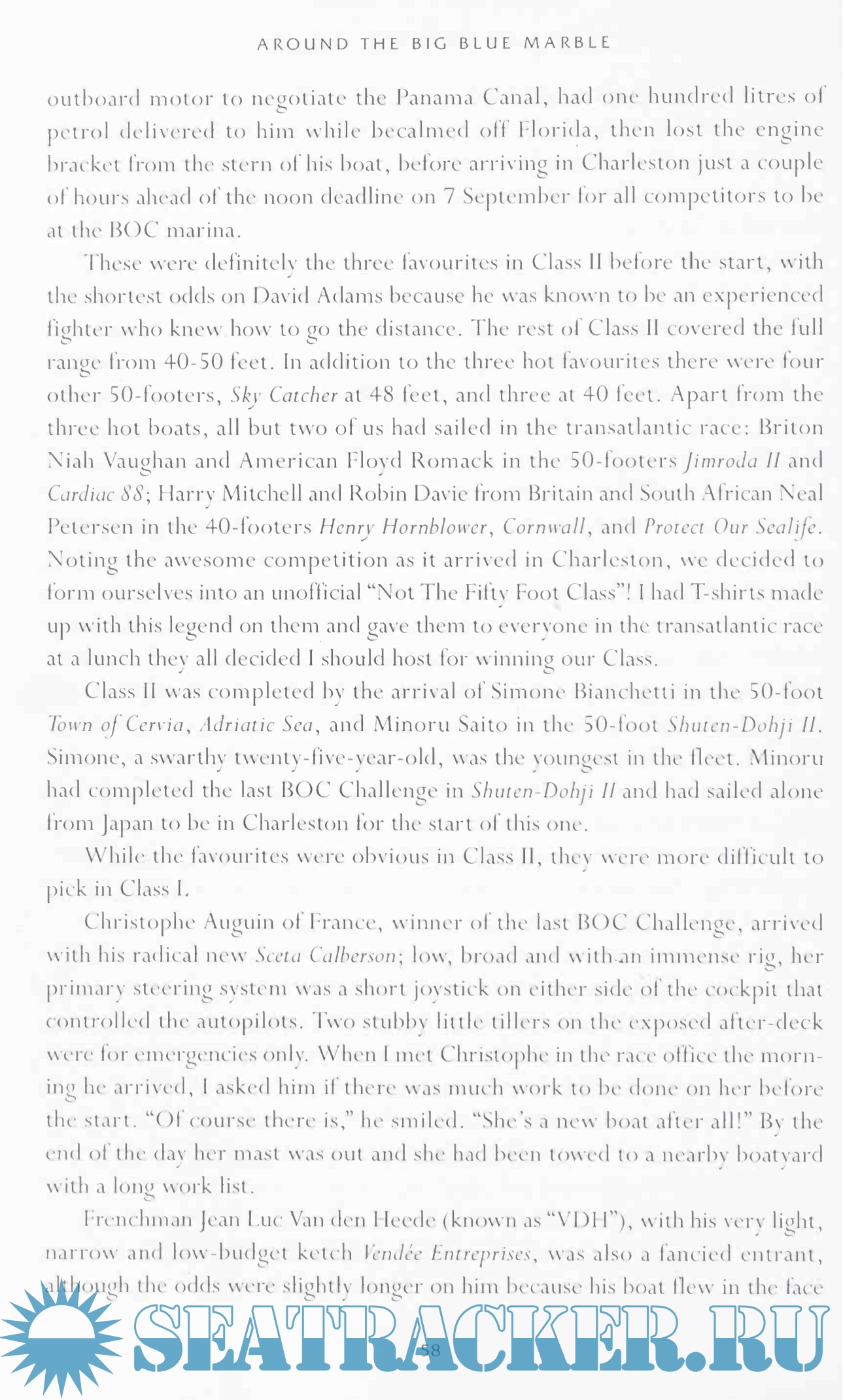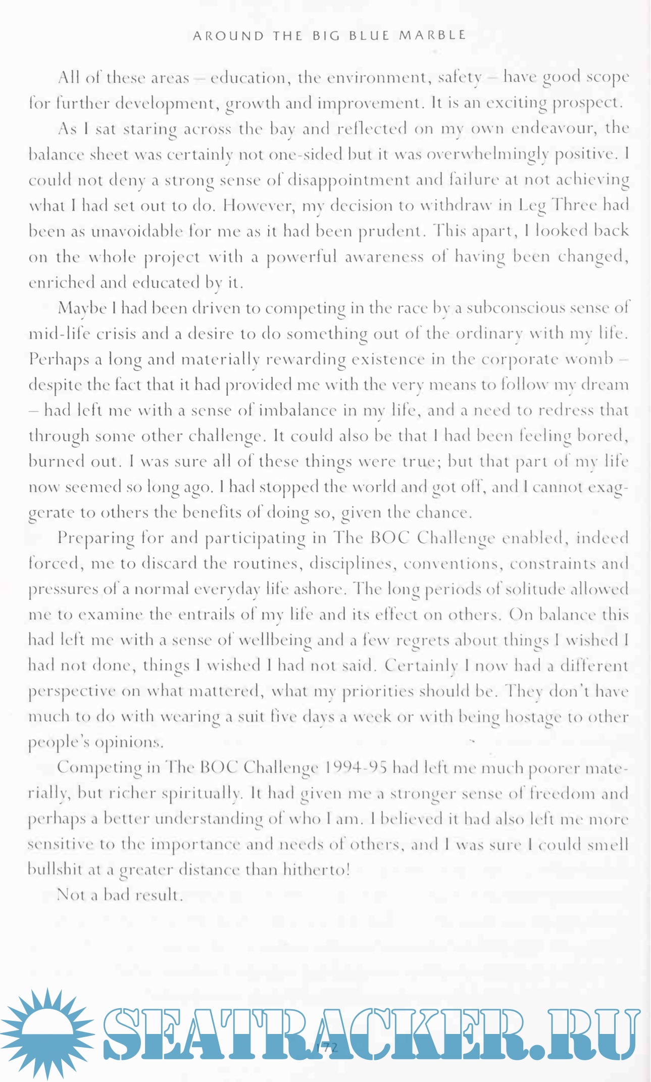In the earlier chajiters of the book, the author entertainingly describes his development from novice sailor to world-class yachtsman, and outlines his preparations for The BOC Challenge which included winning his Class in the 3500-mile transatlantic curtain-raiser to the big event. Rarely, it seems, was any of it plain sailing.