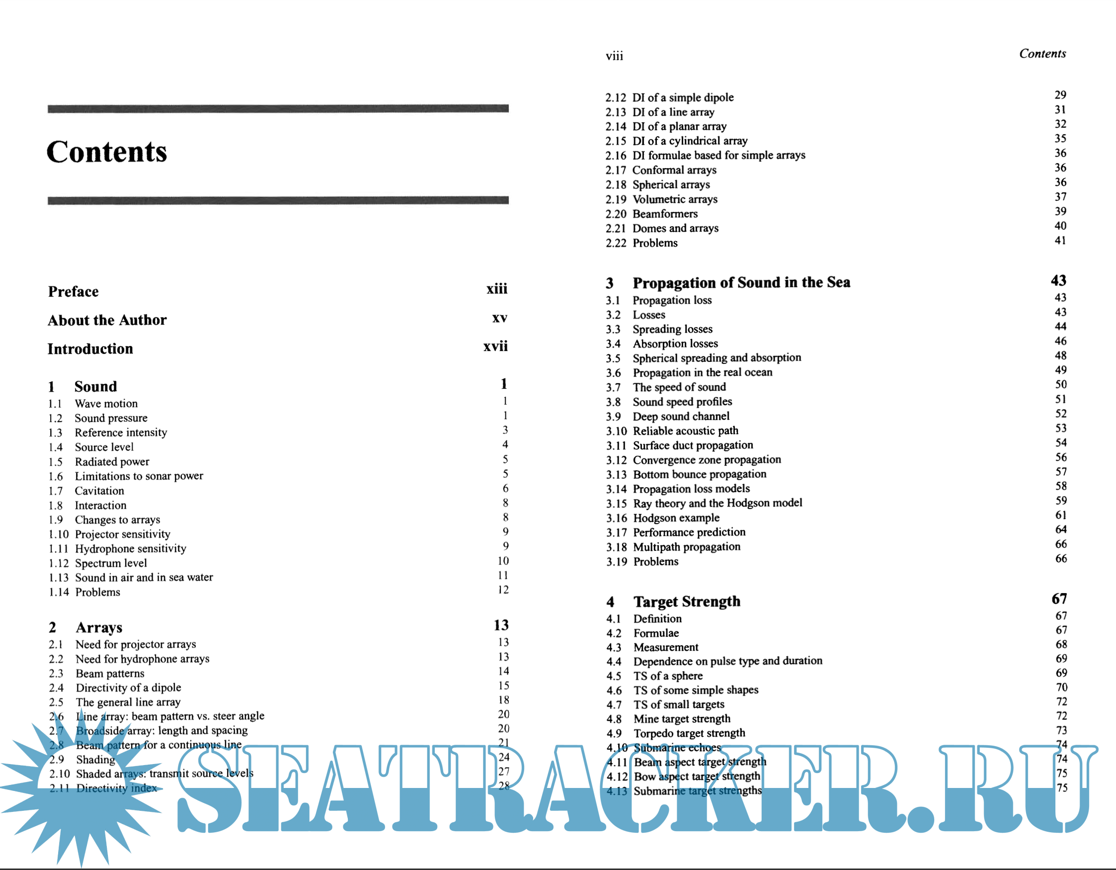 * Equipment parameters: the motion of sound in an elastic medium; definitions of sound intensity and source level; the use of projector arrays to increase the source level; the use of hydrophone arrays to improve the signal to noise ratio of a wanted sound.