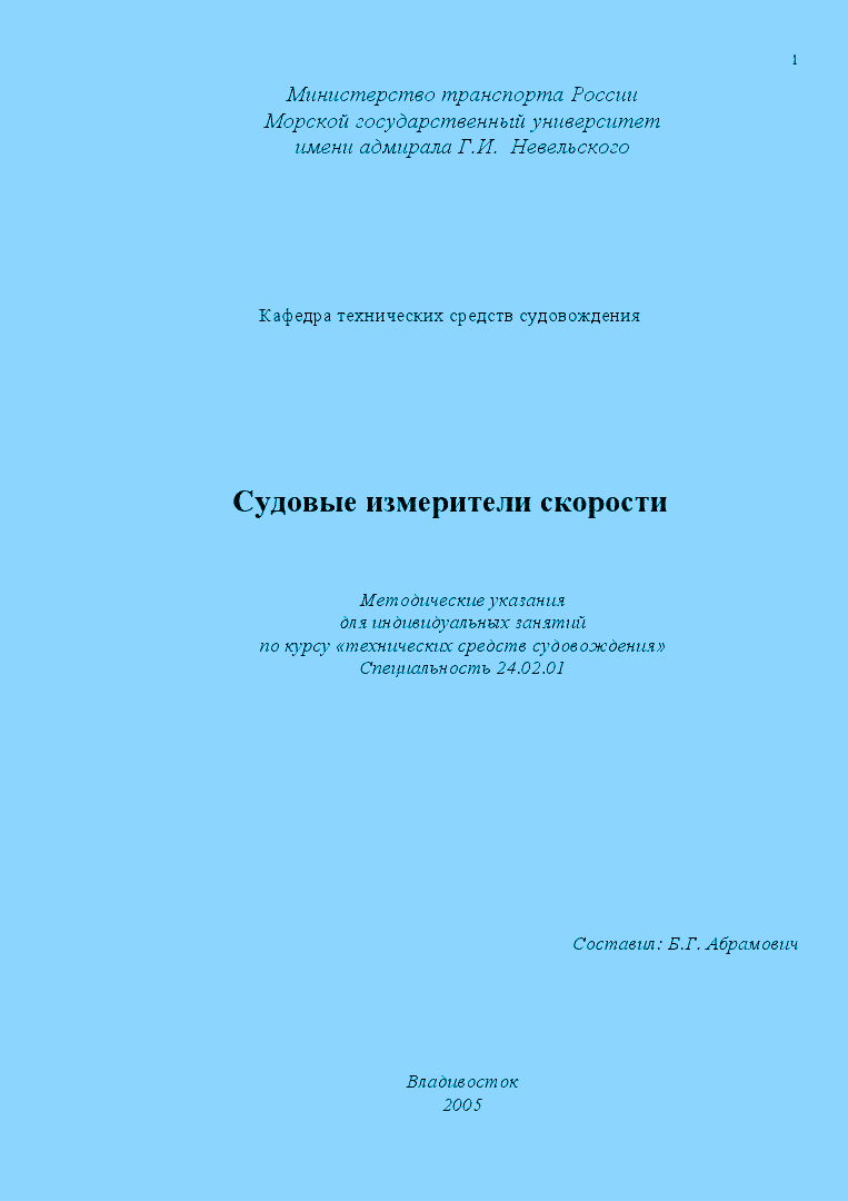 Описание: Методические указания для индивидуальных занятий по курсу "Технические средства судовождения". Приведены методические указания для индивидуальных занятий по курсу "Технические средства судовождения", посвященные современным судовым измерителям скорости.