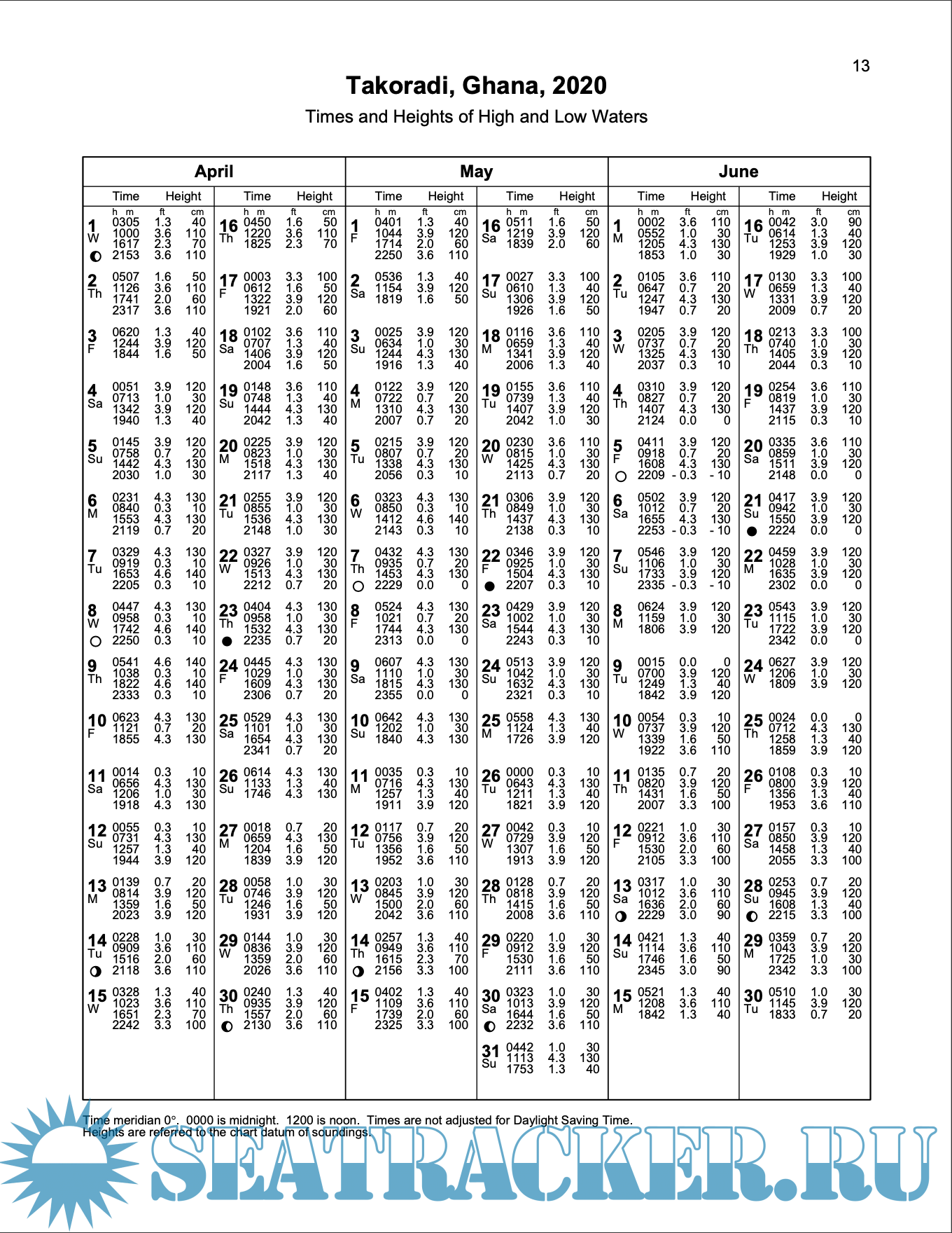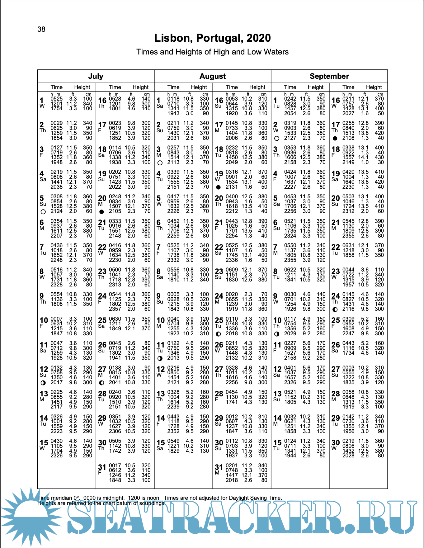 Description: Contains full daily predictions for 38 reference stations and differences and ranges for more than 1,100 stations. It also contains a t able for obtaining the approximate height of the tide at any time, a table of local mean time of sunrise and sunset for every 5th day, a table for the reduction of local mean time to standard time, a table for converting feet to centimeters, a table of the Greenwich mean time of the Moonsí phases, apogee, perigee, greatest north and south and zero declination, and the time of the solar equinoxes and solstices, and a glossary of terms. This book comes is published as one part in a set of four volumes, along with East Coast of North and South America (Including Greenland)), West Coast of North and South America (including the Hawaiian Islands), and Central and Western Pacific Ocean and Indian Ocean.