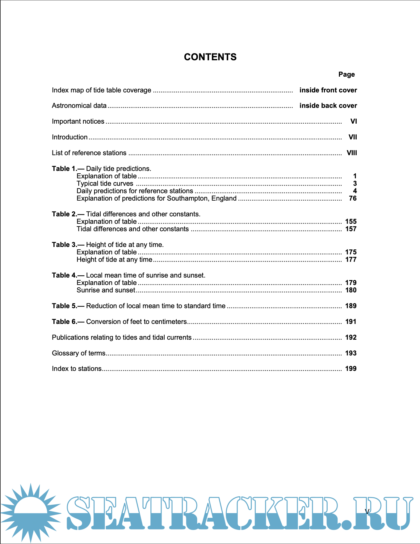 Year: 2019 Language: english Author: NOAA Genre: Reference book Publisher: Department of Commerce-United States of America Edition: 2019 Format: PDF Quality: eBook Pages count: 206 Description: Contains full daily predictions for 38 reference stations and differences and ranges for more than 1,100 stations. It also contains a t able for obtaining the approximate height of the tide at any time, a table of local mean time of sunrise and sunset for every 5th day, a table for the reduction of local mean time to standard time, a table for converting feet to centimeters, a table of the Greenwich mean time of the Moonsí phases, apogee, perigee, greatest north and south and zero declination, and the time of the solar equinoxes and solstices, and a glossary of terms. This book comes is published as one part in a set of four volumes, along with East Coast of North and South America (Including Greenland)), West Coast of North and South America (including the Hawaiian Islands), and Central and Western Pacific Ocean and Indian Ocean.