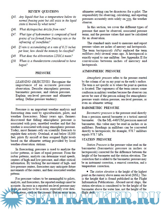 Aerographer’s Mates are enlisted sailors who monitor sea conditions, analyze meteorological data, and develop accurate forecasts. Their responsibilities include: being the Navy’s meteorological and oceanographic experts, distributing weather data, collecting, recording and analyzing weather and oceanographic information, making visual and instrument observations of weather and sea conditions, interpreting satellite data, radar imagery, and meteorological and oceanographic codes. This US Navy self-study course is organized into subject matter areas, each containing learning objectives along with text and illustrations, in order to help understanding. The subject matter reflects day-to-day requirements and experiences of personnel in the rating or skill area.