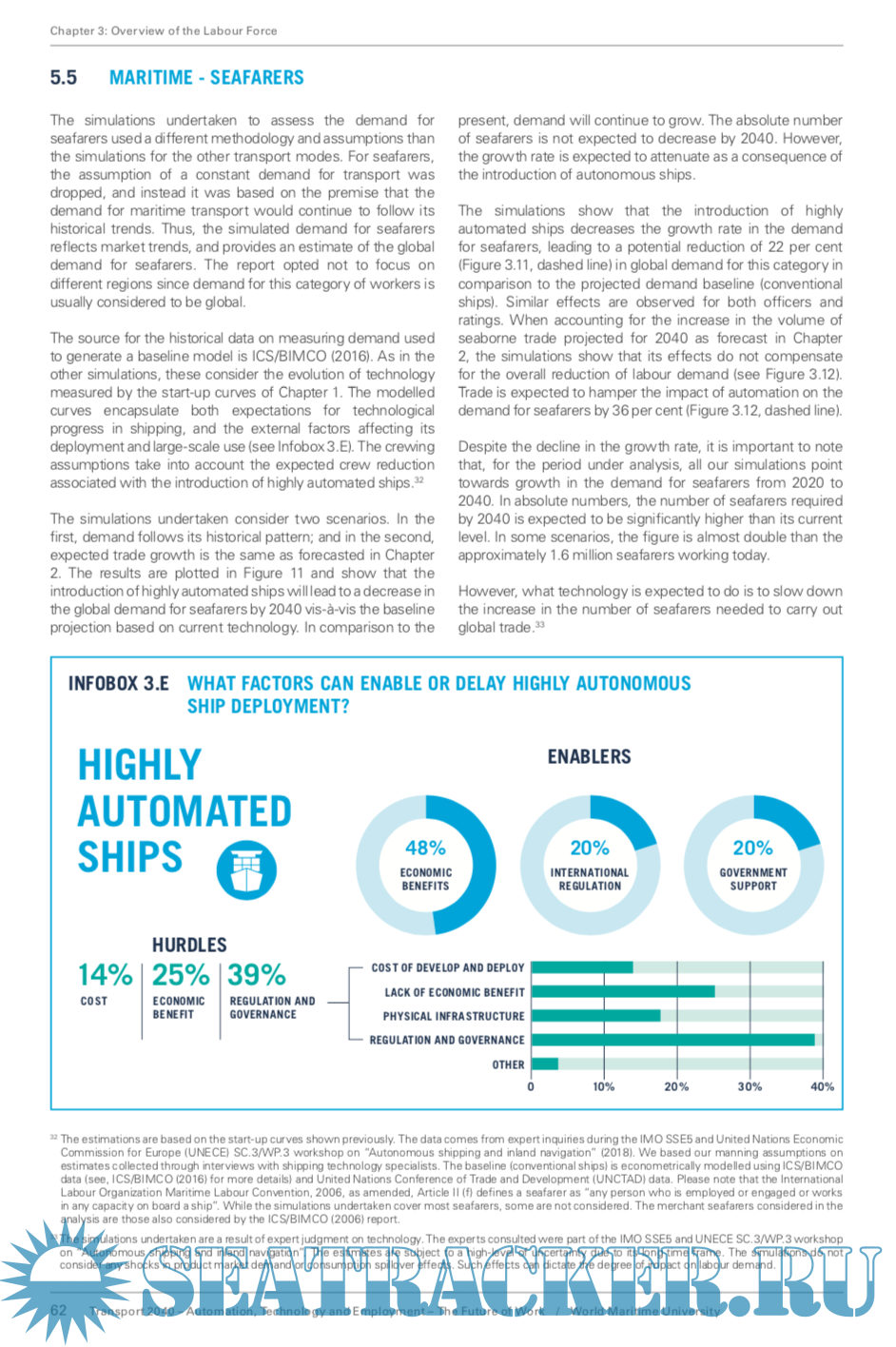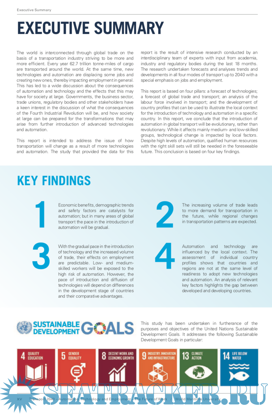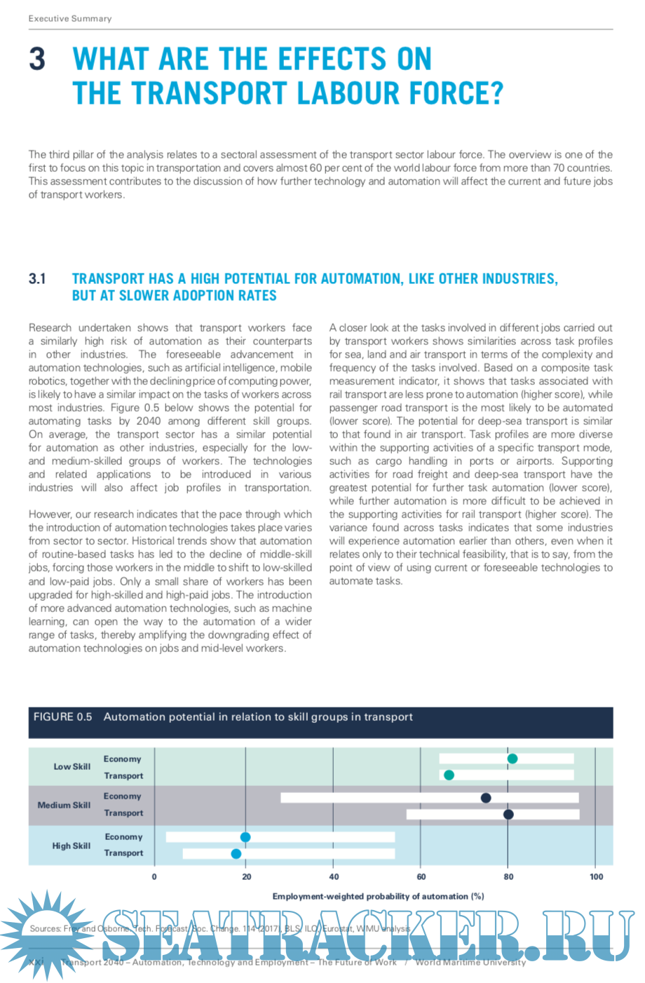 This report focuses on providing evidence on the effects of automation and new technologies on the global transport labour force by 2040. Currently, we are about to embrace what is now termed the 4th Industrial Revolution (4IR), which is characterized by the introduction of artificial intelligence, robotics, more and more interconnection, among other innovations. As this report focuses on the global transport sector, examples illustrating the transformative capabilities of automation and technology span from driverless trains already used in metros in different parts of the world, to truck platooning, or convoying, in road transport, which represents a new level of automation; from the technology for automatic baggage handling systems in airports to automated and semi-automated container terminals in ports. In the maritime sector, recent discussions about autonomous ships have triggered a number of activities at the International Maritime Organization (IMO). Equipment manufacturers have created the notion that automated ships could be operating in larger numbers in a few years.