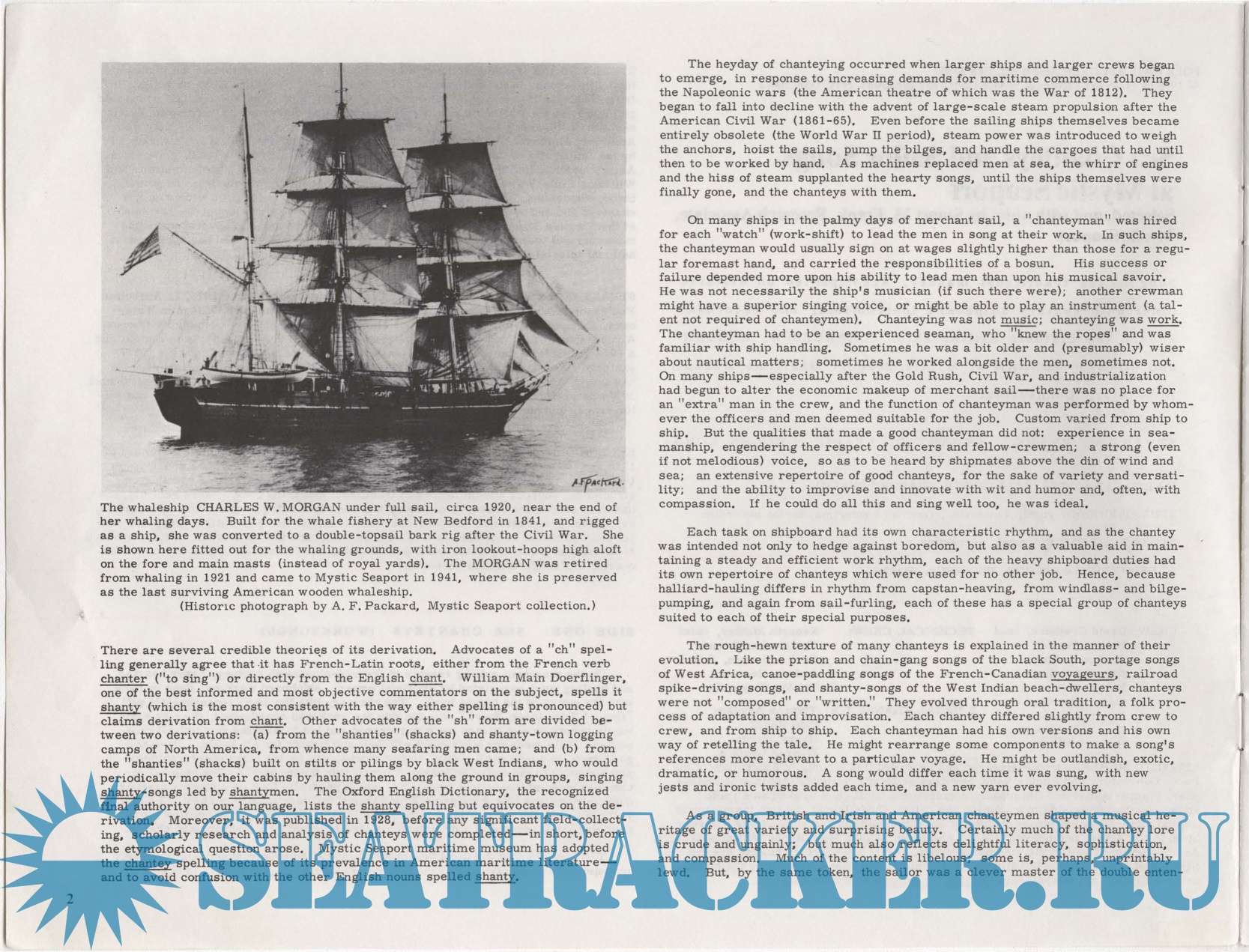Year: 1978 Language: english Author: Frank S.M. at all. Genre: History Publisher: Folkways Records Format: PDF Quality: Photo of pages Pages count: 22 Description: This album features classic sea shanties from the 19th century, "sung in the traditional manner, accompanied on historic 19th-century instruments, and recorded aboard historic sailing ships" at the Mystic Seaport Maritime Museum. Shanties were sung to make the heavy labor aboard merchant sailing vessels more coordinated, efficient, and lighter. "To hear a good yarn, and sing out a lively, rowdy chorus, was far more pleasurable" than listening to the Bosun yelling orders. Liner notes include background on chanties, song lyrics, and black-and-white photographs of sailors. Additional info: Recorded aboard the historic ships Charles W. Morgan and Joseph Conrad.