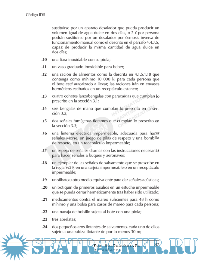 Year: 2017 Language: spanish Author: IMO Genre: Technical book Publisher: IMO Edition: 2017 ISBN: 9789280116540 Format: PDF Quality: eBook Pages count: 347 Description: It provides international requirements for the life-saving appliances, including personal life-saving appliances like lifebuoys, lifejackets, immersion suits, anti-exposure suits and thermal protective aids; visual aids, such as parachute flares, hand flares and buoyant smoke signals; survival craft, such as life rafts and lifeboats; rescue boats; launching and embarkation appliances and marine evacuation systems line throwing appliances; and general alarm and public address systems.