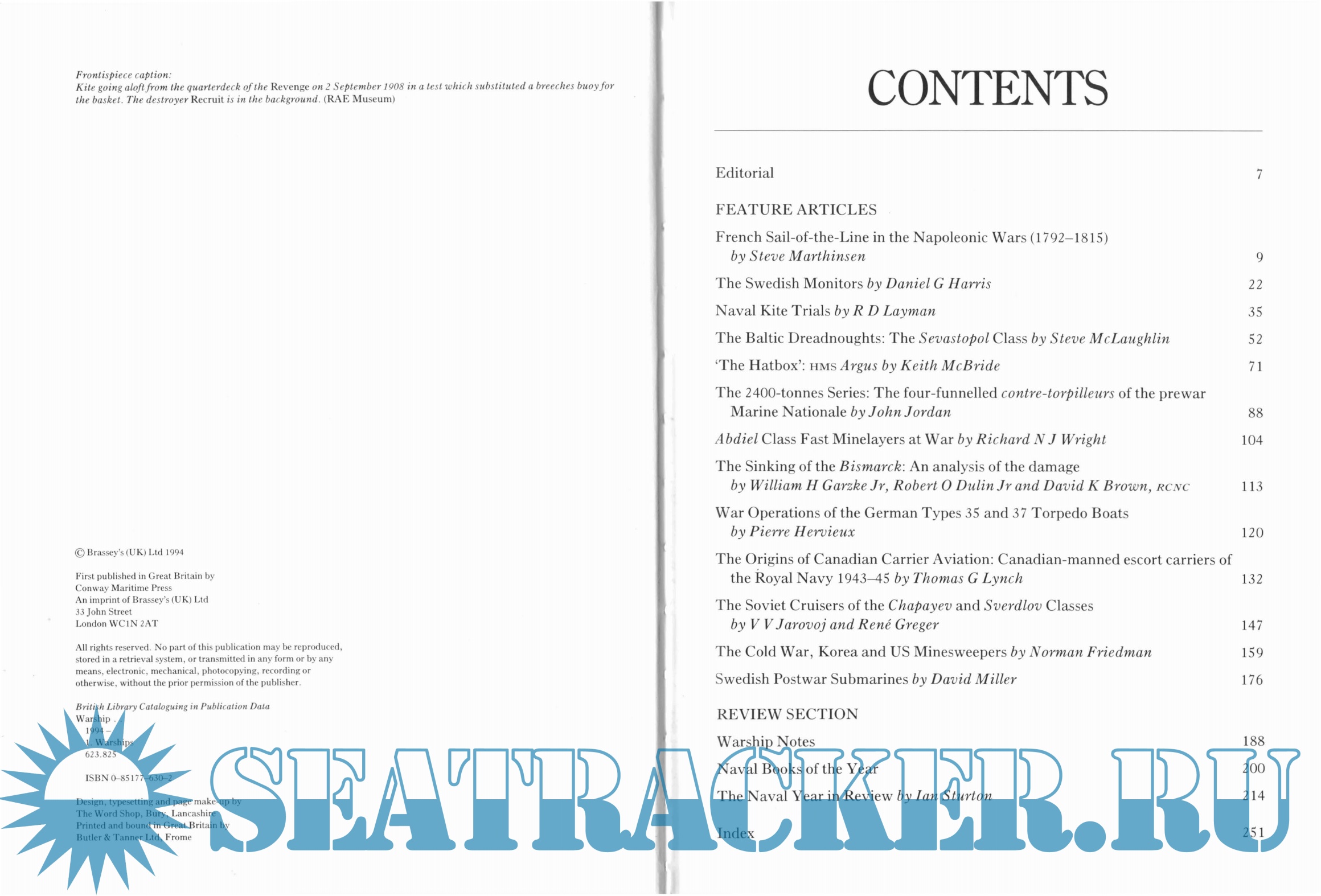 Description: Warship 1994 is devoted to the design, development and service history of naval vessels. The book includes a wide range of articles, stretching in time from the Napoleonic Wars to the present day, in geography from Canada to Korea, and in subject matter from the mainstream of the "Bismarck" to the decided backwaters of naval kite trials. Regular features include "Naval notes", a comprehensive collection of book reviews, and a survey of the main events of the naval year. The articles include Napoleonic ships of the line, Swedish monitors, the "Sevastopol"-class deadnoughts, the carrier "Argus", fast minelayers, damage to the "Bismarck", Canadia escort carriers, Soviet post-war cruisers and US minesweepers in Korea.