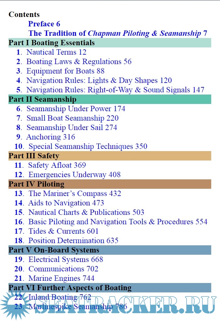 Year: 2017 Language: english Author: Jonathan Eaton Genre: Manual Publisher: Sterling Publishing Edition: 68 ISBN: 978-1-61837-244-4 Format: EPUB Quality: eBook Pages count: n/a Description: The reputation of Chapman Piloting & Seamanship, as an authoritative resource for mariners, is based upon the work of hundreds of people and organizations, since its first publication in 1917. This manual steadly remains one of the fundamental pillars for the knowledge of navigation and seamanship, alongside Bowditch and Dutton's. The 68th Edition of Chapman Piloting & Seamanship celebrates the 100th year of continual publication of “The Bible of Boating”. Previous editions have been reorganized to more closely relate to boating, as it is practiced in today’s era of technology. New chapter on engines has been grouped with two existing chapters (electrical systems and communications) to create a new major subdivision for onboard systems. The use of GPS and chartplotters has been integrated, for the first time, with traditional chart and compass navigation, but without any loss of detail or emphasis in Chapman’s coverage of the latter. Every chapter has been enhanced.