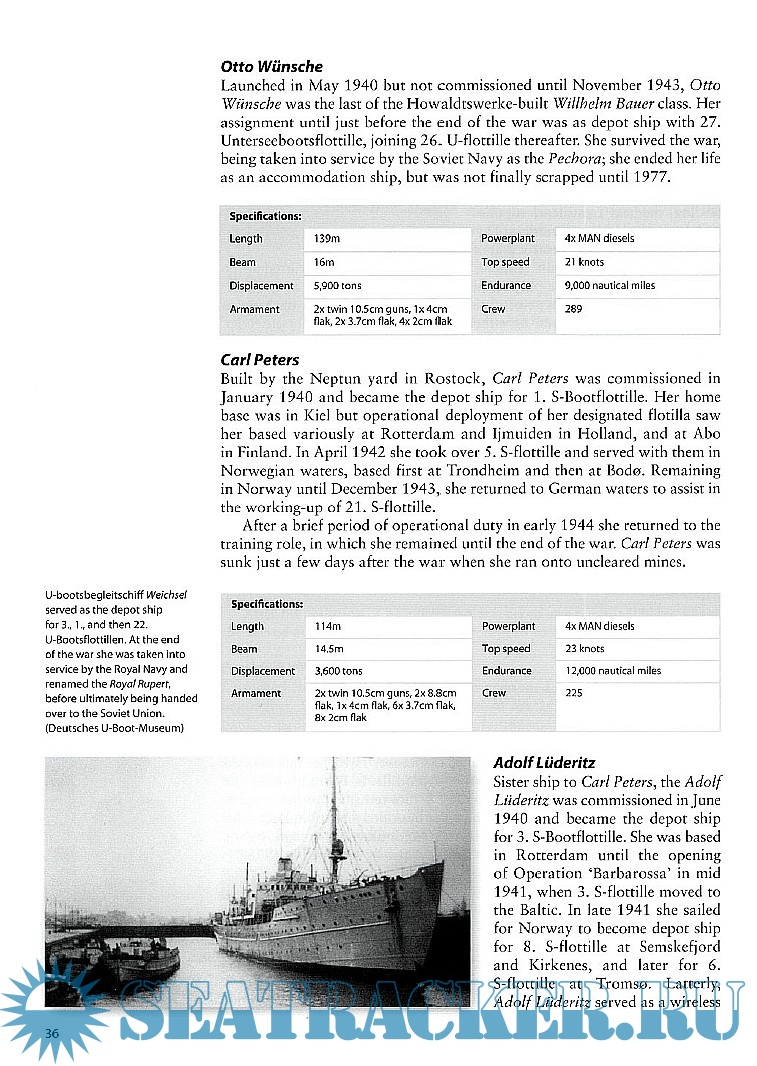 Year: 2009 Language: english Author: Gordon Williamson Genre: History Publisher: Osprey Publishing ISBN: 978-1-84603331 Format: PDF Quality: OCR without errors Pages count: 52 Description: While the pocket battleships and U-boats attract much of the attention paid to the wartime German Navy, the coastal and support branches represented by far the greater number of vessels and men, and the great majority of sea-duty. Without these ships no fleet could function. Germany's minesweepers alone formed a massive proportion of its total strength, and smaller branches of the Kriegsmarine were responsible for escort duties, patrol services, fleet auxiliary roles such as refuelling, hospital and accommodation ships and sail training. This book describes the most important of these minor warships - the characteristics, organization, deployment and war service of minesweepers, patrol and escort craft and torpedo boats; but also the vital fleet auxiliary supply ships, such as the famous Altmark, accomodation ships such as the ill-fated Wilhelm Gustloff, the depot tenders for U- and S-boat flotillas, and even the majestic pre-war sail training vessels.