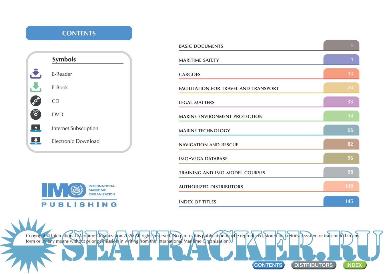 Description: IMO Publishing’s activities provide the world’s maritime community with numerous texts (conventions, codes, regulations, recommendations, guidelines, etc.) prepared by the Organization. There are over 200 titles available in English. Many are translated into Arabic, Chinese, French, Russian and Spanish. IMO Publishing also produces digital products, namely e-books, e-readers, electronic downloads, CDs and internet subscriptions. The dissemination of this information, including attendance at maritime exhibitions worldwide and regular e-newsletters to interested parties, plays an important role in promoting shipping as a safe, secure, efficient and environmentally-friendly method of transporting goods around the globe.