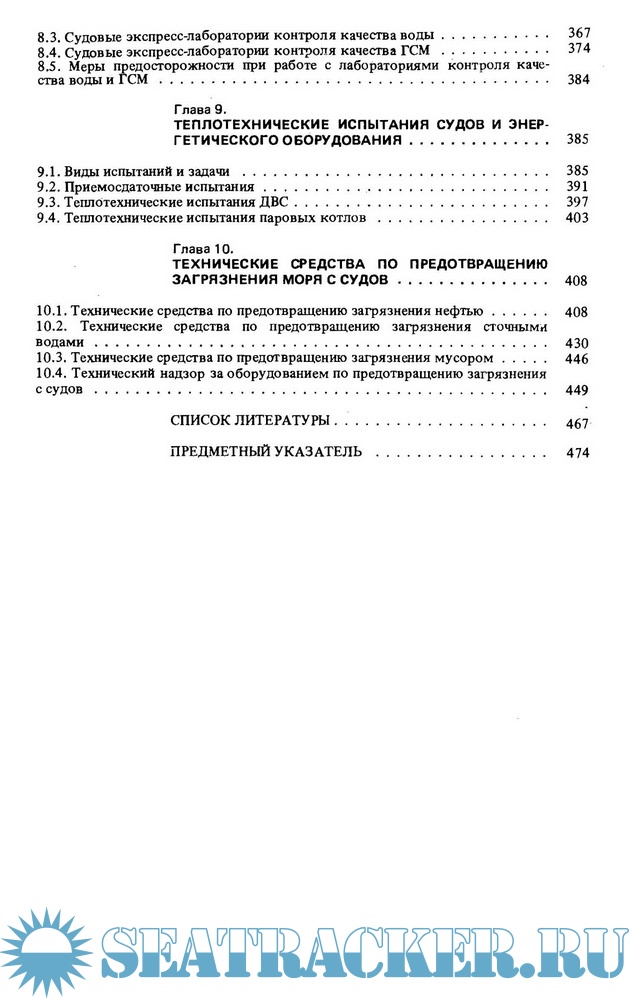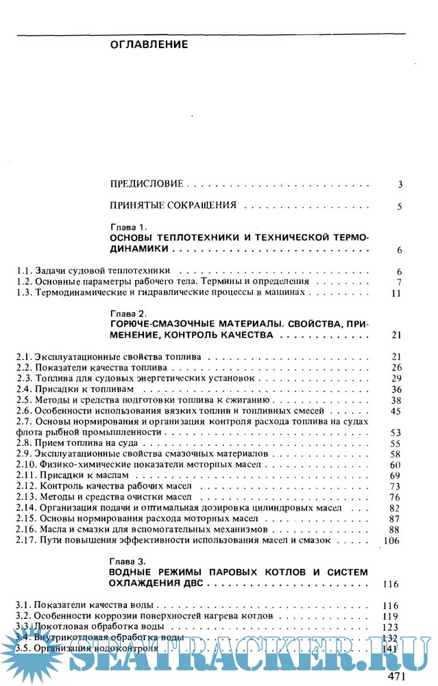 Рассмотрен комплекс вопросов судовой теплотехники, включающий организацию теплотехнического контроля на судах, эффективное использование горюче-смазочных материалов, выбор режимов работ энергетических установок, порядок теплотехнических испытаний, методы и средства очистки судового оборудования от эксплуатационных отложений, технические средства по предотвращению загрязнения окружающей среды с судов.
