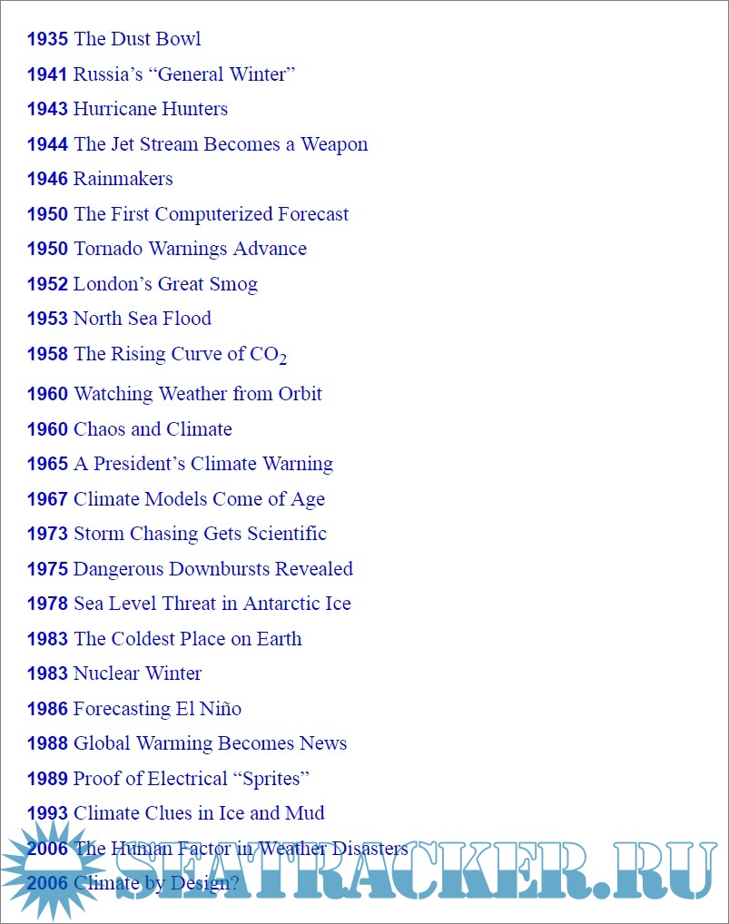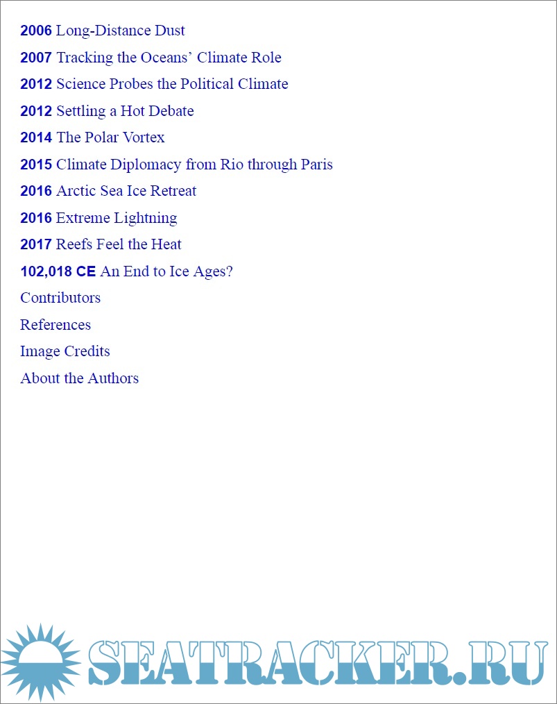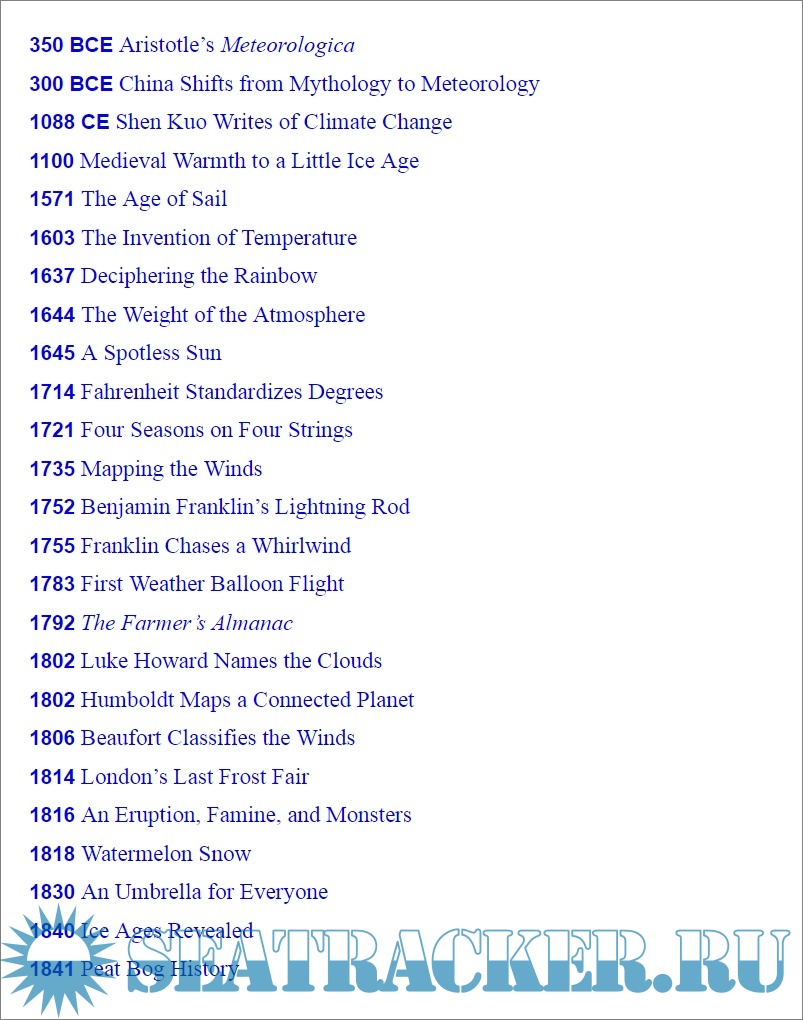 Description: This easy reading, illustrated book is a history of humanity’s evolving relationship with Earth’s dynamic climate system and the weather it generates. It is divided into a hundred short chapters, each of which is illustrated and dedicated to a year, or a period, and traces a particular aspect of the climate and its relationship with humanity. From prehistory to today’s headlines and tomorrow’s forecasts, topics covered are Earth's first atmosphere, the physics of rainbows, the deadliest hailstorm, Groundhog Day, the invention of air conditioning, London’s Great Smog, the Year Without Summer, our increasingly strong hurricanes, and the Paris Agreement on climate change, among others.