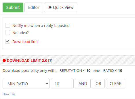 Due to numerous requests, the Reputation Limit system on tracker has been modified. Added a new condition: ratio limit. Now, when creating a release, the releaser can add 2 conditions for downloading: