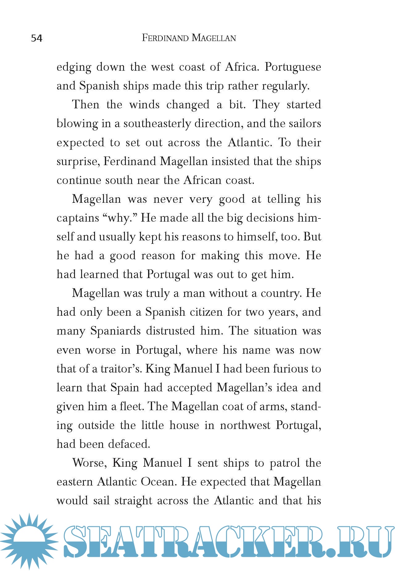 Description: Magellan set out in 1519 with five ships to find a passage through the Americas. Such a passage, if it existed, would allow Spanish ships to follow a westward route to the East Indies. After months of fruitless searching, Magellan eventually found a narrow, dangerous sea passage at the bottom of South America-now called the Strait of Magellan. In 1522, a lone ship sailed into the harbor at Seville, making its crew the first men to sail completely around the world.