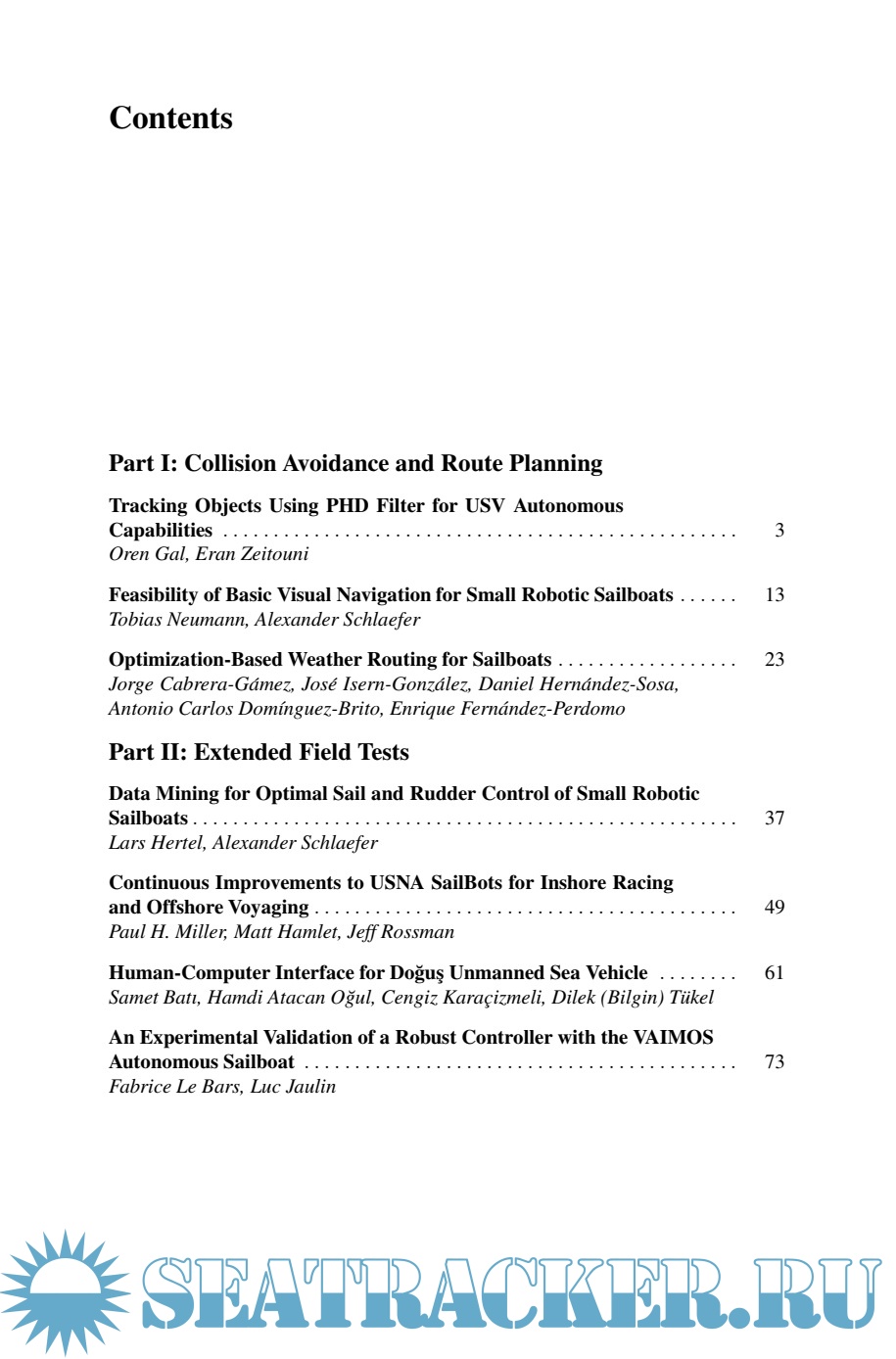 Year: 2013 Language: english Author: Sauzé C., Finnis J. (eds.) Genre: Conference Publisher: Springer-Verlag Berlin Heidelberg Edition: 1st ISBN: 978-3-642-33084-1 Format: PDF Quality: Scanned pages Pages count: 131 Description: Robotic sailing offers the potential of wind propelled vehicles which are sufficiently autonomous to remain at sea for months at a time. These could replace or augment existing oceanographic sampling systems, be used in border surveillance and security or offer a means of carbon neutral transportation. To achieve this represents a complex, multi-disciplinary challenge to boat designers and naval architects, systems/electrical engineers and computer scientists. Since 2004 a series of competitions in the form of the Sailbot, World Robotic Sailing Championship and Microtransat competitions have sparked an explosion in the number of groups working on autonomous sailing robots. Despite this interest the longest distance sailed autonomously remains only a few hundred miles. Many of the challenges in building truly autonomous sailing robots still remain unsolved. These proceedings present the cutting edge of work in a variety of fields related to robotic sailing. They will be presented during the 5th International Robtoic Sailing Conference, which is taking place as part of the 2012 World Robotic Sailing Championships.