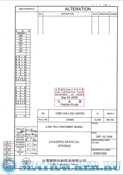 Year: 2009 Language: english Author: CSBC Corporation, Taiwan Publisher: CSBC Corporation, Taiwan Format: PDF Quality: Scanned pages Pages count: 248 Description: The final manual of 4200 TEU Container Vessel.