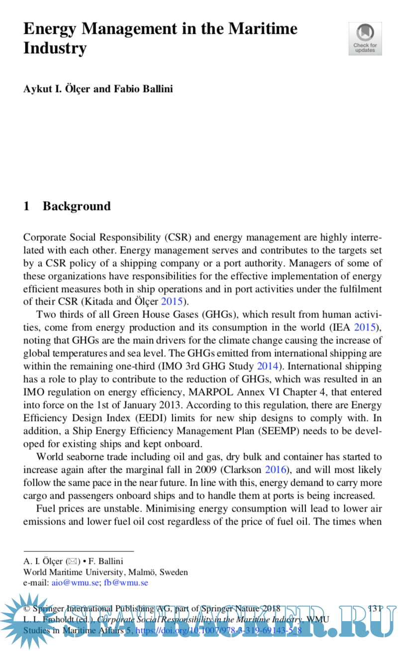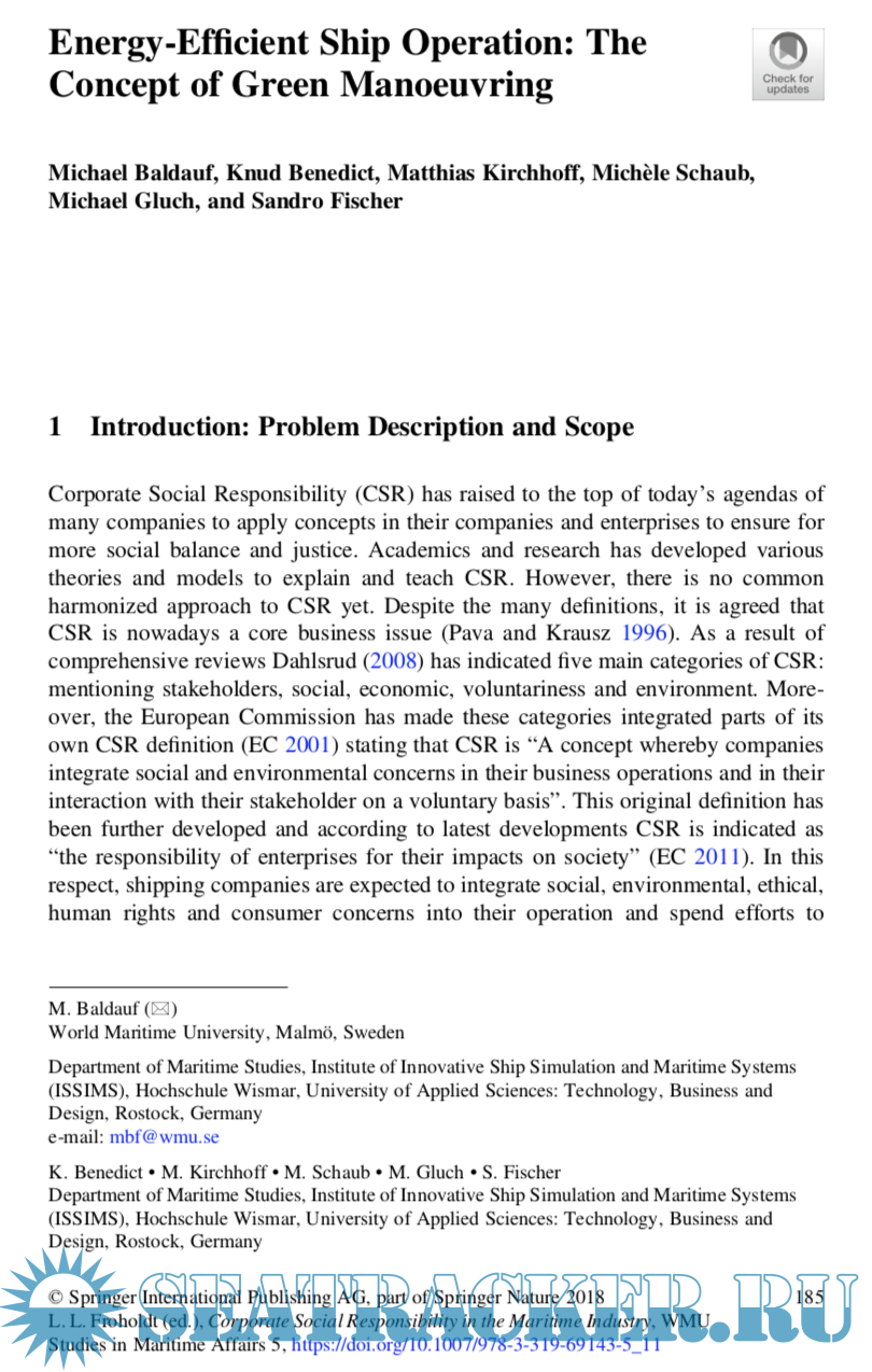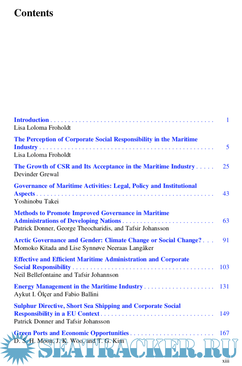 Year: 2018 Language: english Author: Lisa Loloma Froholdt (Editor) Genre: Research papers Publisher: Springer and WMU ISBN: 978-3-319-69143-5 Format: PDF Quality: eBook Pages count: 303 Description: This book captures the intersection of two major waves of changes; why is catching this intersection important and why now? To quote the editor, ‘We need industry, the regulators, education and research—the whole triple helix!’ to get together to ‘make our planet great again’, to quote President Macron. That this work, which stands at the intersection of these two significant waves of change, is published in a book by the World Maritime University (WMU) is a fitting example of synergy and the importance of these two waves of change. My hope is that this publication will spur and support another wave of change in the shipping and logistic sector showing that CSR is not just about regulations but also about voluntary actions—it also offers concrete proof that small-scale voluntary action is decidedly a positive step to making ‘our planet great again’. The two waves of change are the following: one wave is related to the change in perception and understanding of the term ‘maritime’—originating as a term to refer to the carrying of cargo by ships going back to early settlements and now used to encompass the complete logistic chain from manufacturer to consumer where ships are a vital part of a complex logistic chain. The focus on ships and logistics tends to hide the other facet of the term ‘maritime’, namely, the biodiversity, ecosystem services and resources in our oceans and the use/misuse of those resources. The second wave of change is that of corporate social responsibility (CSR)/sustainability. CSR has shifted from a focus on social justice and philanthropy to the concept of planet, people and profit well illustrated by the publication of the first-ever interna- tional consensus standard on (C)SR ‘Guidance on social responsibility’ ISO 26000:2010 where the term (C)SR encompasses planet, people and profit. The two terms CSR and sustainability are used interchangeably. And for good reason, sustainability can be tracked back to the first UN conference in Stockholm in 1972 and the subsequent publication of Our Common Future in 1986, which led to many twists and turns to the agreement of the UN Sustainable Development Goals (SDG) in 2015. Additional info: More information about this series at http://www.springer.com/series/11556