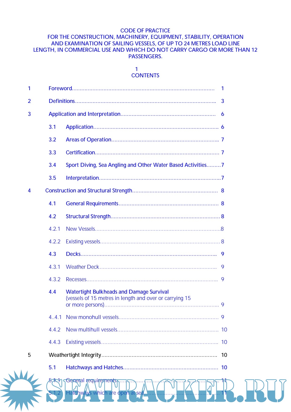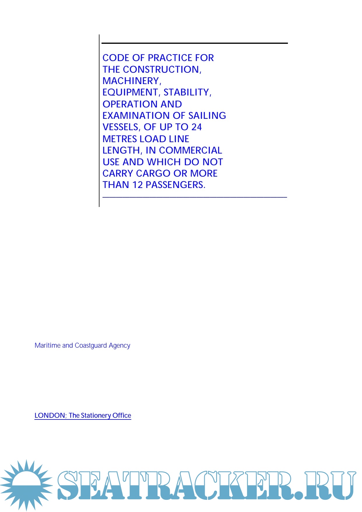 Description: The Code has been developed for application to United Kingdom motor vessels of up to 24 meters Load Line length which are engaged at sea in activities on a commercial basis and which do not carry cargo or more than 12 passengers. The primary aim in developing the Code has been to set standards of safety and protection for all on board and particularly for those who are trainees or passengers. The level of safety it sets out to achieve is considered to be commensurate with the current expectations of the general public. The Code relates especially to the construction of a vessel, its machinery, equipment and stability and to the correct operation of a vessel so that safety standards are maintained.