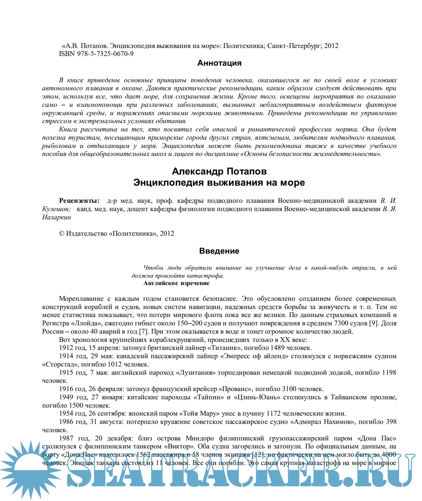 Книга рассчитана на тех, кто посвятил себя опасной и романтической профессии моряка. Она будет полезна туристам, посещающим приморские города других стран, яхтсменам, любителям подводного плавания, рыболовам и отдыхающим у моря. Энциклопедия может быть рекомендована также в качестве учебного пособия для общеобразовательных школ и лицеев по дисциплине «Основы безопасности жизнедеятельности».