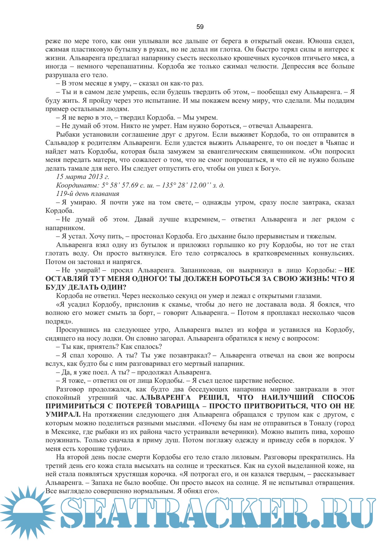Описание: Как долго можно выжить в открытом море, без средств связи, еды и пресной воды? Неделю? Месяц? Год?... Опытный рыбак на акул Альваренга и его помощник 22-летний мексиканец Кордоба отправились ловить акул, но попали в жуткий шторм. Мотор вышел из строя, и их лодку унесло в открытый океан. Без еды, снастей и пресной воды им только и оставалось как дрейфовать на волнах и надеятся на чудо... А ровно через 438 дней жители атолла Эбон, входящего в состав Маршалловых островов и находящегося в 10 000 километров от Мексики, заметили рядом со своим жилищем худого мужчину в разодранной одежде и обросшего густой бородой... Эта история так поразительна, что некоторые до сих пор не верят в ее подлинность. Но правда порой оказывается гораздо невероятнее реальности.
