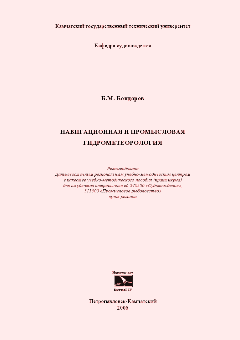 Навигационная и промысловая гидрометеорология Год выпуска: 2006 Язык: русский Автор: Бондарев Б.М. Жанр: Гидрометеорология Издательство: Камчат ГТУ Формат: PDF Качество: Отсканированные страницы Количество страниц: 122 Описание: В учебно-методическом пособии представлены разделы по морской метеорологии, океанографии и промысловой океанографии. В описании всех работ приводятся краткие теоретические обоснования, порядок их практического выполнения и задания по вариантам. Представлены графики, номограммы, таблицы и схемы, применяемые при выполнении лабораторных работ, а также перечень контрольных вопросов по теме работ.