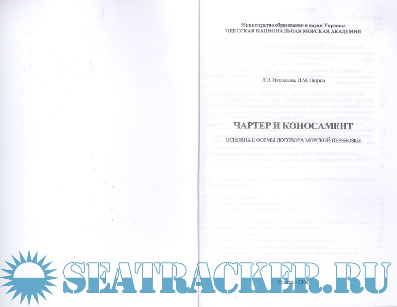 Введение 1. Правовое регулирование морских перевозок 1.1. Понятие договора морской перевозки. 1.2. Чартер и коносамент — наиболее распространённые формы морской перевозки 1.3. О юридической природе договора морской перевозки 1.4. Правовое соотношение чартера и коносамента 2. Чартер как форма договора морской перевозки 2.1. Происхождение и сущность чартера 2.2. Типовые проформы партеров. 2.3. Виды партеров 2.4. Основные условия, содержащиеся в партерах. 3. Роль и основные функции коносамента 3.1. Происхождение коносамента 3.2. Определение коносамента и выполняемые им функции 3.3. Стандартные формы коносаментов 3.4. Обязательные реквизиты коносамента 3.5. Коносаментные условия 3.6. Правила перевозки грузов по коносаментам согласно международным конвенциям 4. Практические аспекты использования коносамента по украинскому законодательству 4.1. Выдача коносамента. 4.2. Описание груза в коносаменте 4.3. Количественная характеристика груза 4.4. Условия и оговорки 4.5. О «чистоте» коносамента и сопутствующих этому понятию условиях., 4.6. Гарантийные письма при выдаче коносамента. 4.7. Передача коносамента. 4.8. Выдача груза получателю. Отсутствие коносамента 4.9. Хранение груза в порту назначения. Продажа груза. 4.10. Ответственность за ущерб, причинённый грузу при морской перевозке . Другие формы договора морской перевозки 5.1. Общие замечания 5.2. Букинг-нот 5.3. Бёрс-нот 5.4. Фиксчюр-нот Приложения Приложение А. Гаагские правила Приложение Б. Гаагско-Висбийские правила Приложение В. Гамбургские правила Приложение Г. Рекомендованная стандартная доверенность на выдачу коносаментов Приложение Д. Рекомендованное стандартное письмо на выдачу груза без предъявления коносамента Приложение Ж. Рекомендованное стандартное письмо на смену порта назначения Литература