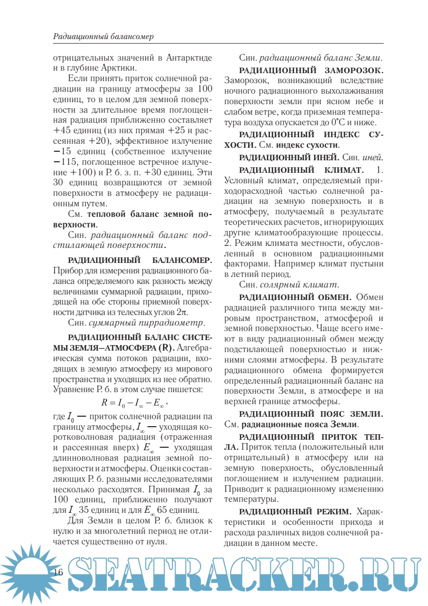 Год выпуска: 2009 Язык: русский Автор: Хайруллин К.Ш., Бедрицкий А.И. Жанр: Энциклопедия Издательство: Летний сад ISBN: 978-5-98856-048-7 Формат: PDF Качество: Отсканированные страницы Количество страниц: 216 Описание: В «Российском гидрометеорологическом энциклопедическом словаре» (РГЭС) приводятся термины и определения, употребляемые в метеорологии, климатологии, гидрологии суши, аэрологии, синоптической метеорологии, а также частично в некоторых смежных науках (географии, гляциологии, экологии).В «Словарь» вошла информация о деятельности головных научно-исследовательских учреждений Росгидромета и некоторые аспекты его международной деятельности.«Словарь» не является учебным пособием — это лишь краткий справочник для широкого круга пользователей: ученых, работников гидрометеорологического профиля, преподавателей, аспирантов, студентов, а также инженерно-технических работников, использующих гидрометеорологическую информацию в прикладных целях.Подготовлен коллективом научных сотрудников Государственного учреждения «Главной геофизической обсерватории им. А. И. Воейкова» (Санкт- Петербург), под редакцией Руководителя Росгидромета, Президента ВМО А. И. Бедрицкого.