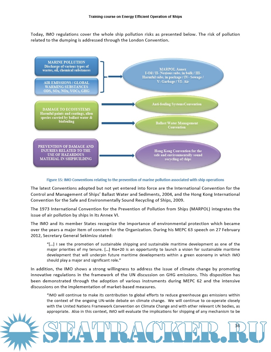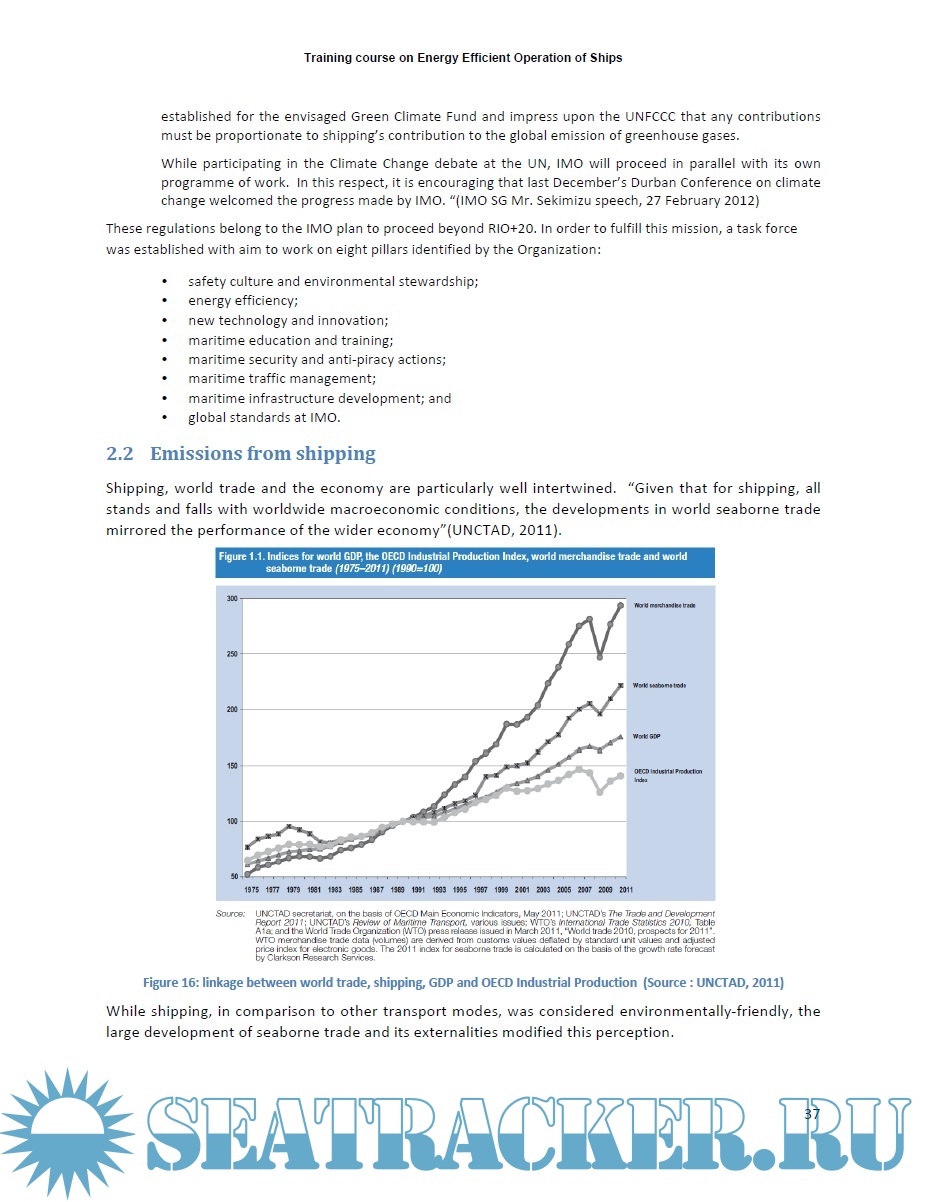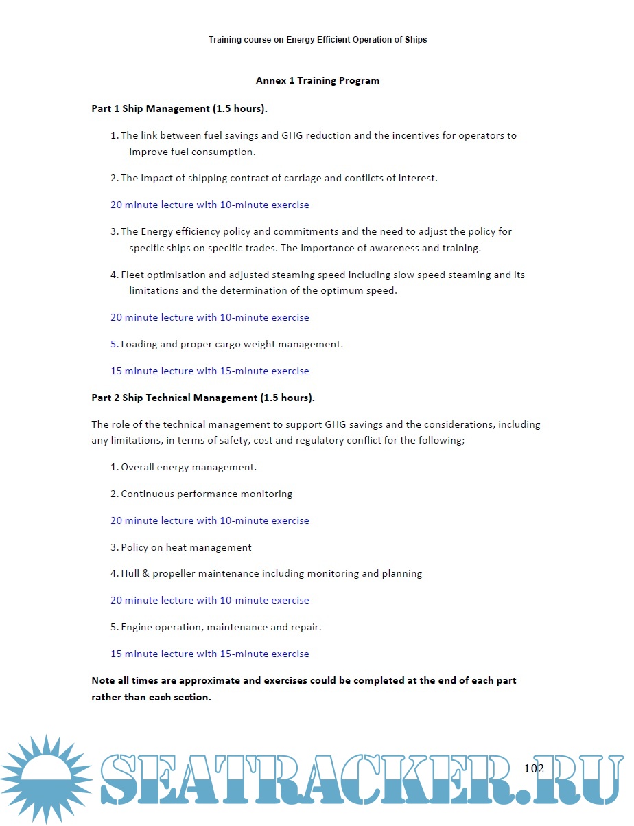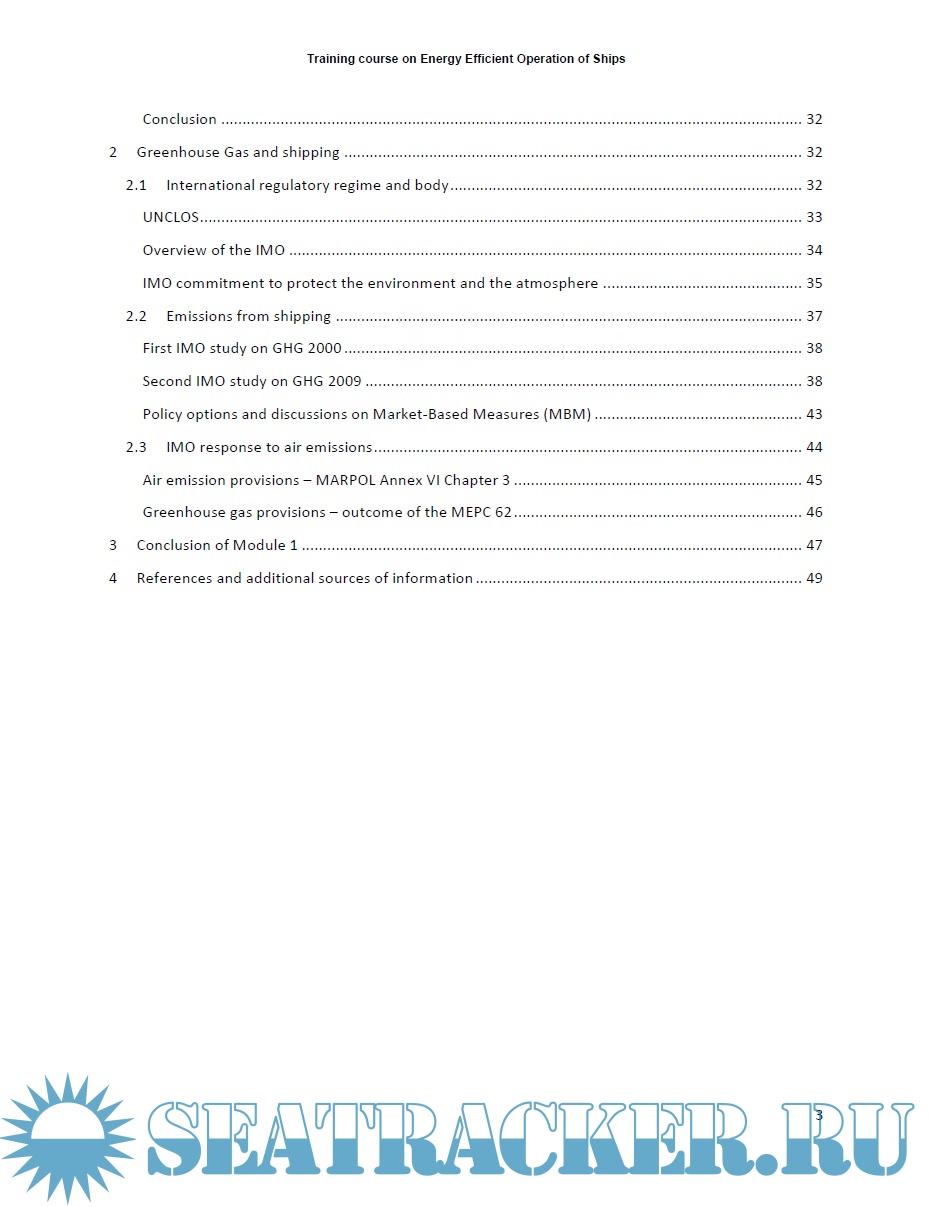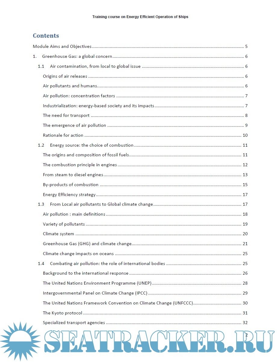Description: This course is designed as an introduction to the problem of energy management of the ship, specifically aimed to personnel having different skills, knowledge and experience in air emission by ships. It provides a common set of knowledge and skills in order to enable participants to spread the knoweledge in their respective countries/organizations and to promote the implementation of energy efficiency policies and MARPOL Annex VI. As the course is not country-specific, and has a global dimension, trainers and instructors are expected to adapt the course to their own context and audience. More than a traditional, academic instruction, this is a hands-on course with exercises, discussion of case studies and practical activities. The course contributes to the IMO's environmental protection goals as set out in resolutions A.947(23) and A.998(25) by promulgating industry "Best Practices", which reduce greenhouse gas (GHG) emissions. The course also covers essential subjects to develop management tools to assist a shipping company in managing the environmental performance of its ships.