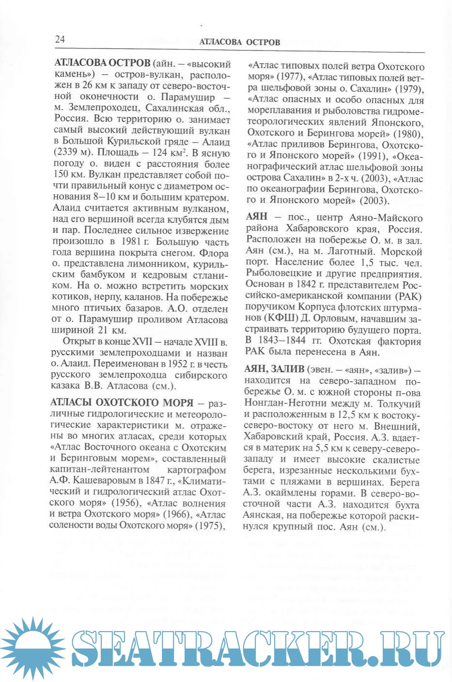 Описание: Издание посвящено одному из российских дальневосточных морей - Охотскому морю, входящему в акваторию Тихого океана. Энциклопедия содержит более 700 статей о гидрографических и географических объектах, а также гидрологических особенностях моря. Представлены наиболее значительные природные объекты: острова, полуострова, заливы, реки, их географические особенности, хозяйство, культура и история, а также города, порты, водные, биологические ресурсы, международные соглашения, научно-исследовательские учреждения, деятельность выдающихся ученых, исследователей, путешественников. Обращено внимание на проблему территориальной принадлежности Курильских о-вов. Дается хронология основных событий, ставших знаменательными вехами в истории открытий и освоения Охотского моря с XVI века до наших дней.