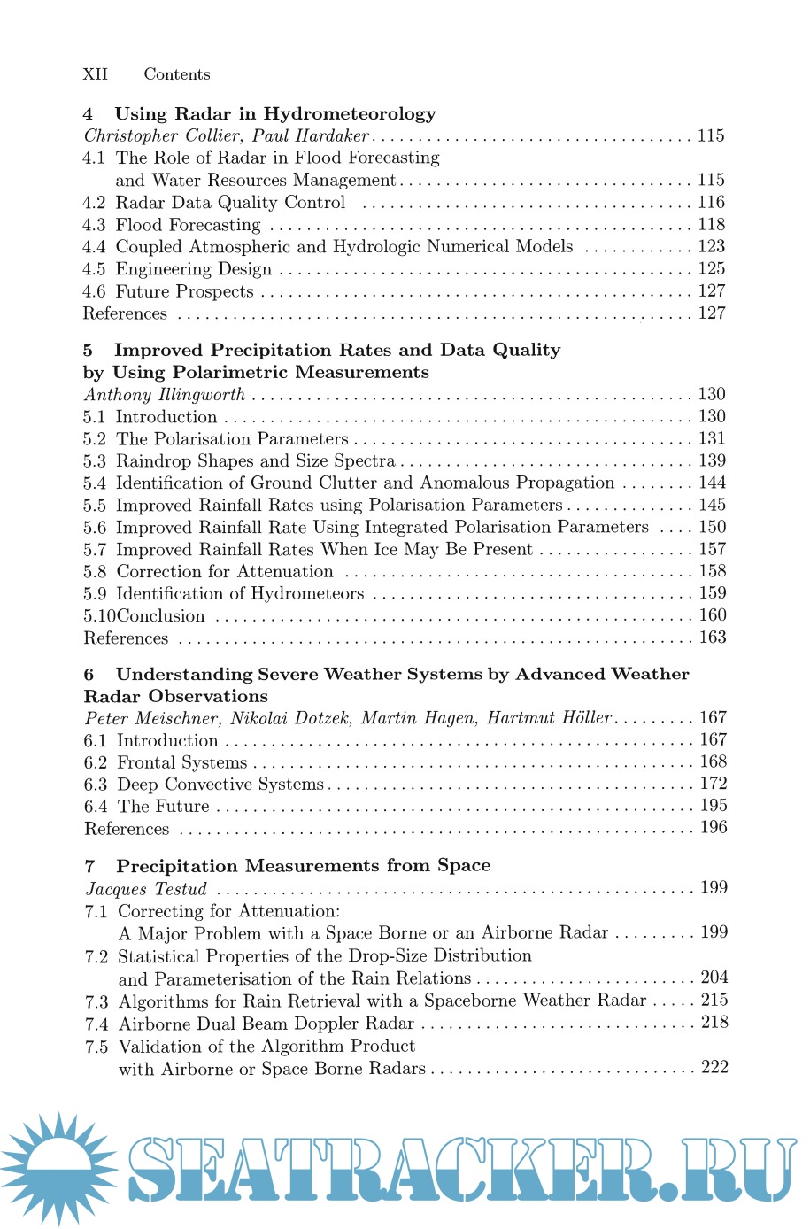 Year: 2004 Language: english Author: Meischner P. (eds.) Genre: Technical book Publisher: Springer-Verlag Berlin Heidelberg Edition: 1st ISBN: 978-3-662-05202-0 Format: PDF Quality: Scanned pages Pages count: 351 Description: Weather radar systems provide data necessary for the understanding of weather systems, improved forecasts (especially critical for severe weather), hydrological applications, flood warnings and also for climate research in which ground verification is needed for global precipitation measurements by satellites. This book offers an accessible overview of advanced methods, applications and modern research from the European perspective. An extensive introductory chapter summarizes the principles of weather radars and discusses the potential of modern radar systems, including Doppler and polarisation techniques, data processing, and error-correction methods. Addressing both specialist researchers and nonspecialists from related areas, this book will also be useful for graduate students wishing to specialize in this field.