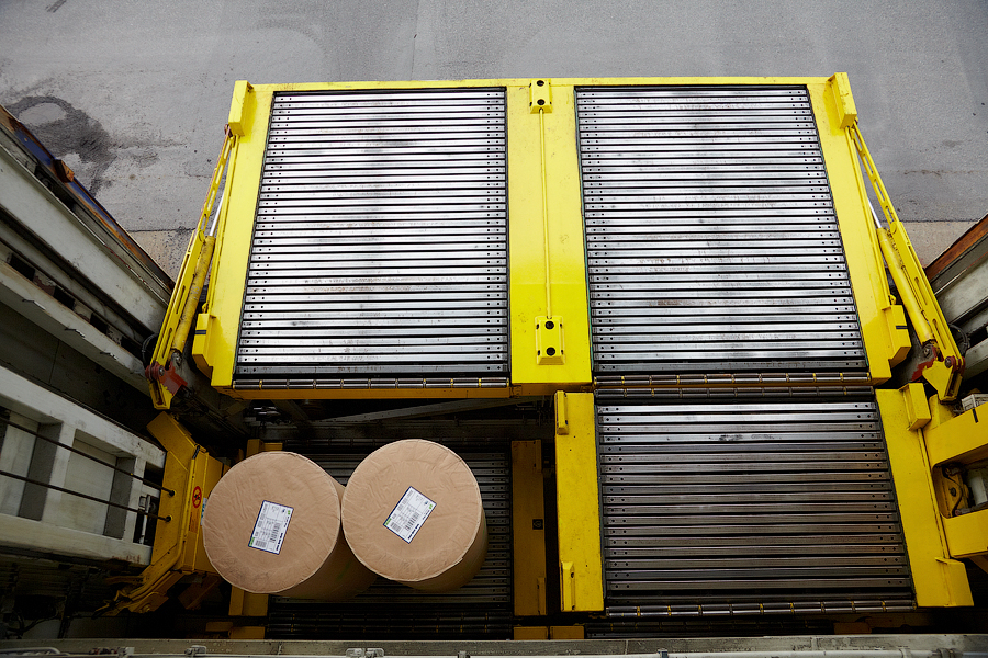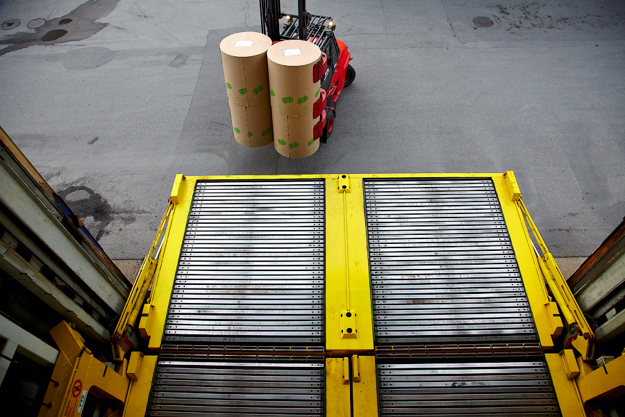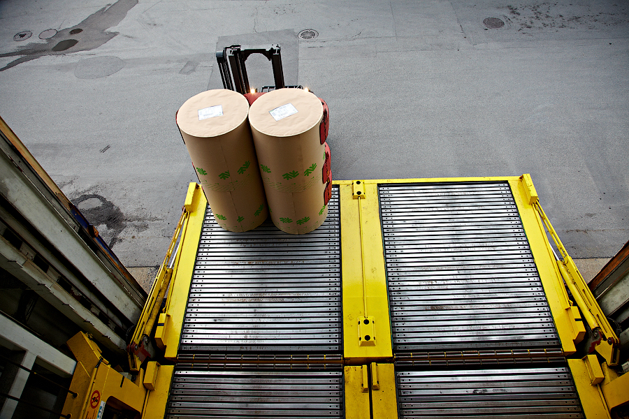 Рулон бумаги ставится на грузовую платформу: