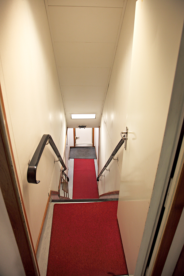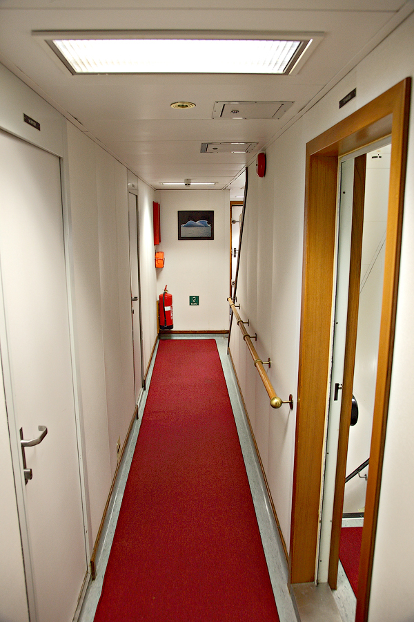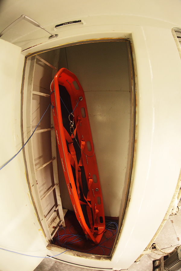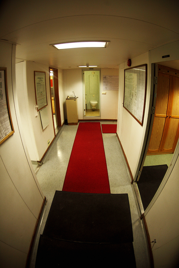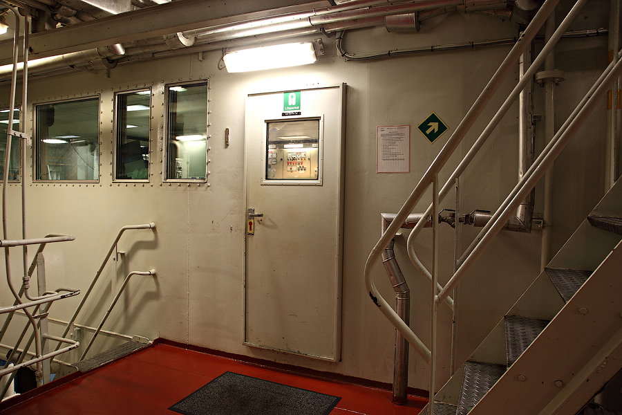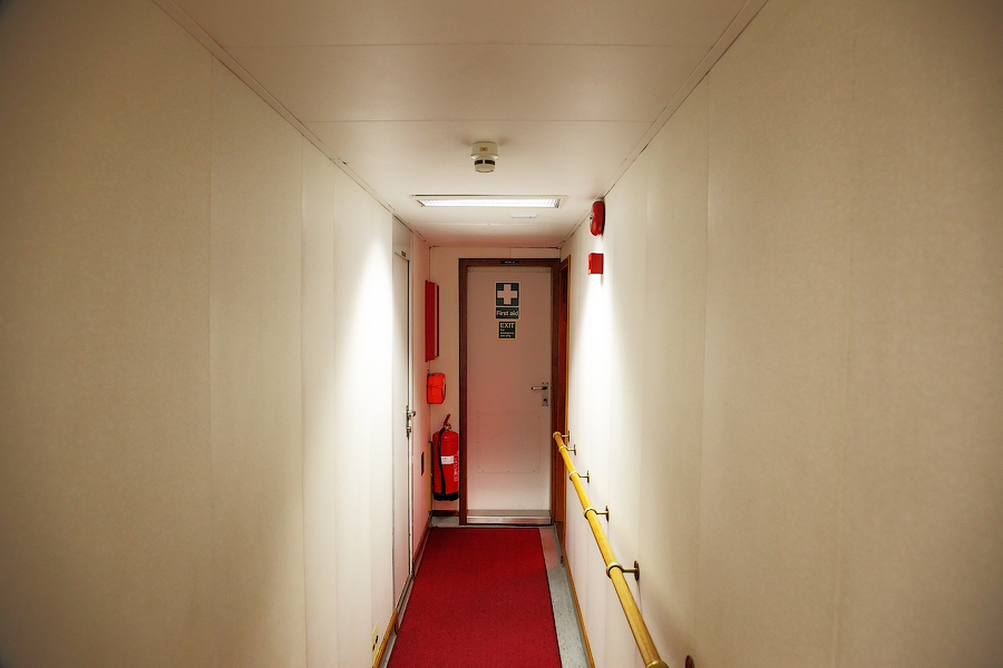 Действительно,выглядит жутковато.Расположенное в конце коридора помещение для оказания первой медицинской помощи недвусмысленно нам намекает,что прорываться мимо каюты второго механика (слева на снимке) нам нужно как можно тише и незаметней.